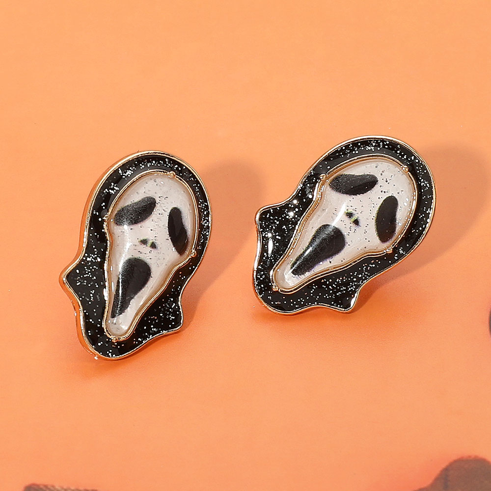 Details • Size : 0.7" X 1" • Post Back • Spooky ghost face stud earrings with glitter detail, perfect for Halloween costumes, parties, or eerie seasonal style. Lightweight and eye-catching. • Hypoallergenic • Lead and Nickel Compliant