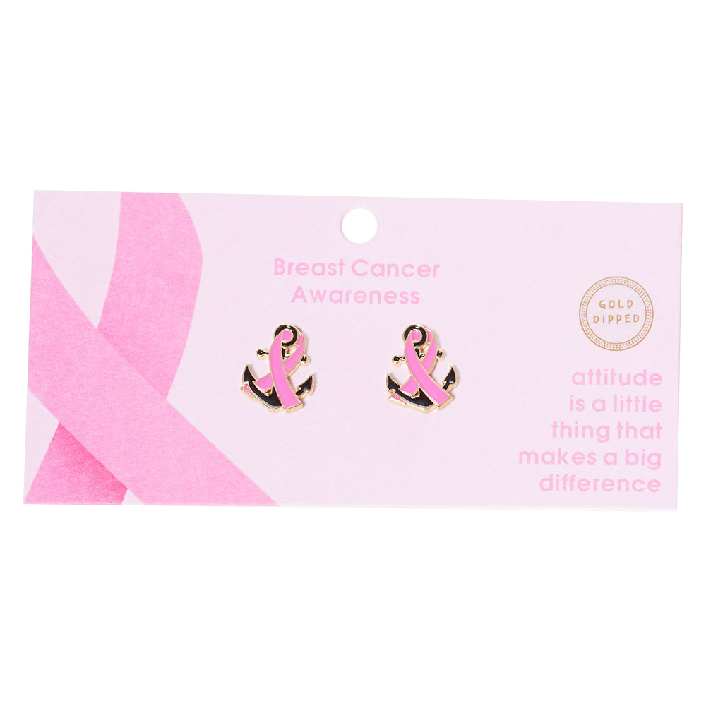 Details • Size : 0.6" X 0.75" • Post Back • Show your support with these Pink Ribbon Anchor earrings, symbolizing strength, resilience, and hope. Featuring a striking anchor design intertwined with the iconic ribbon, this meaningful jewelry makes a powerful statement of awareness, courage, and unshakable support. • Lead and Nickel Compliant • Made In Korea • Gold Dipped
