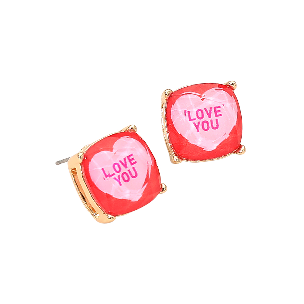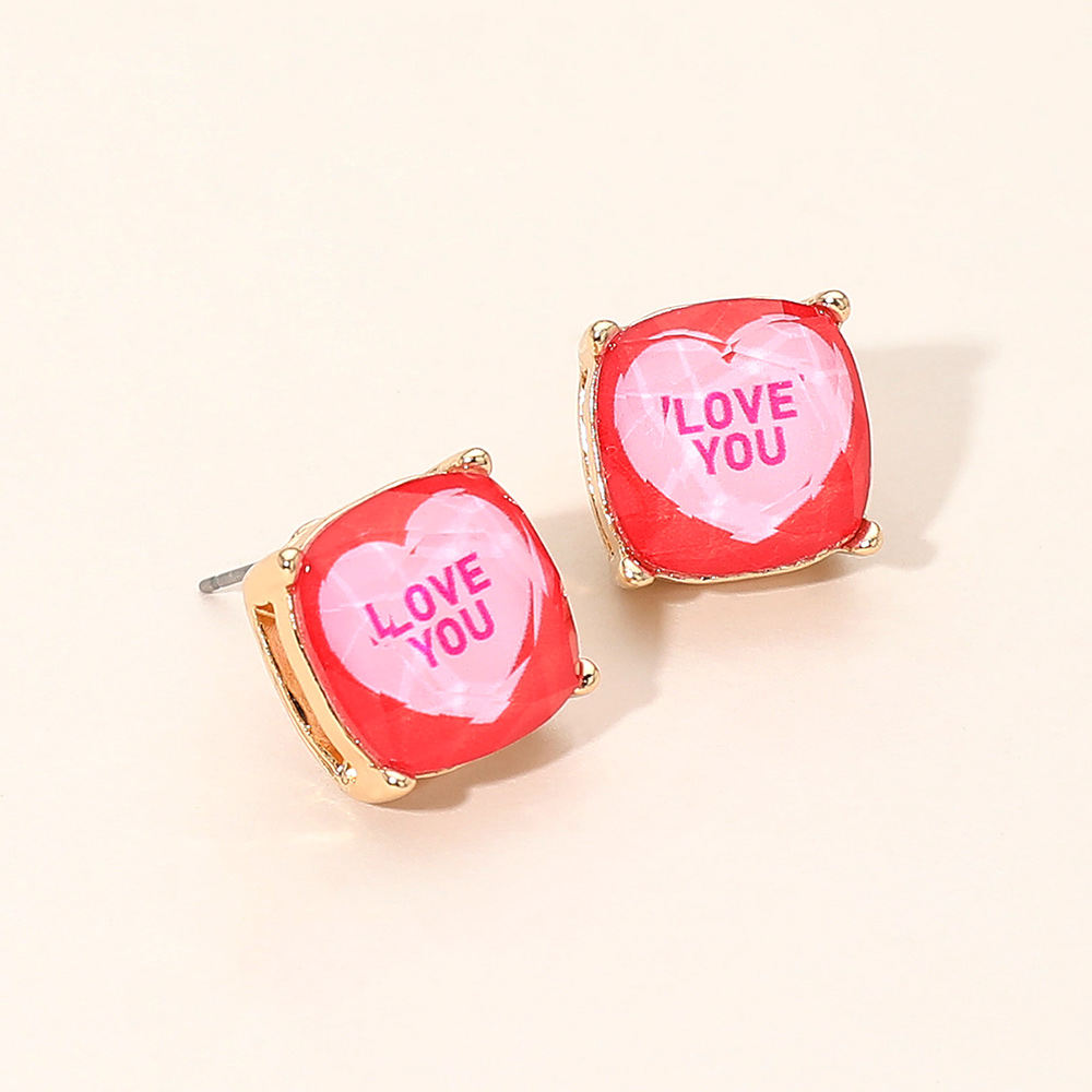 LOVE YOU Message Heart Square Cushion Stud Earrings