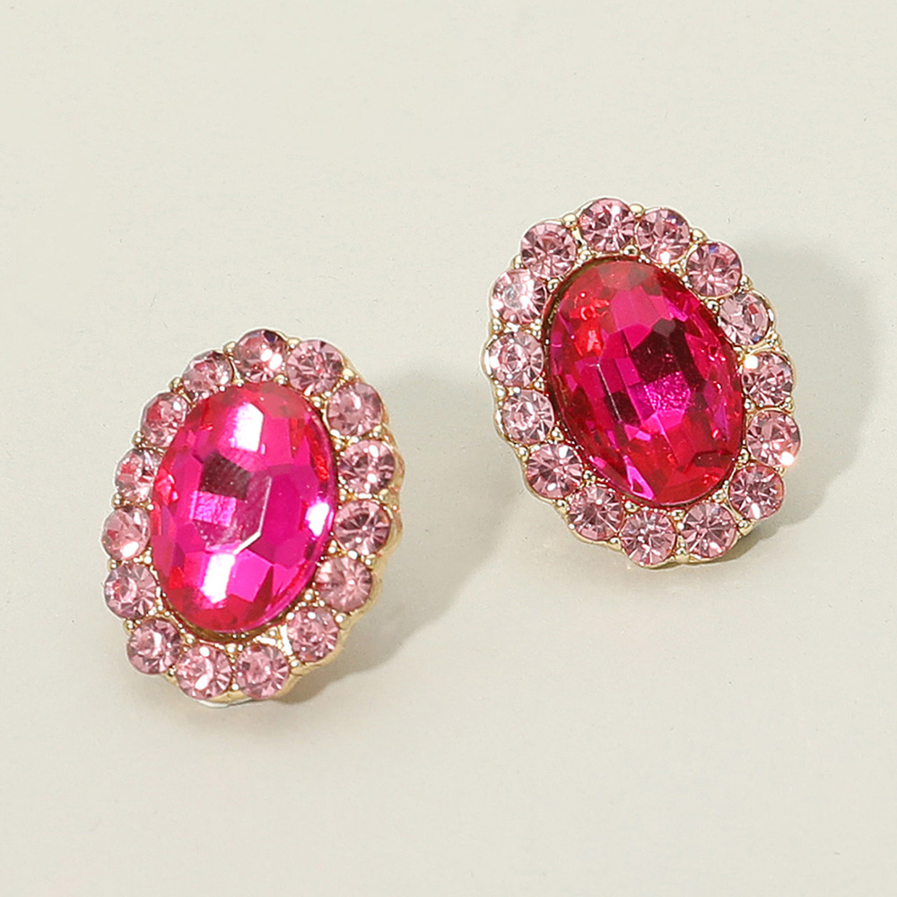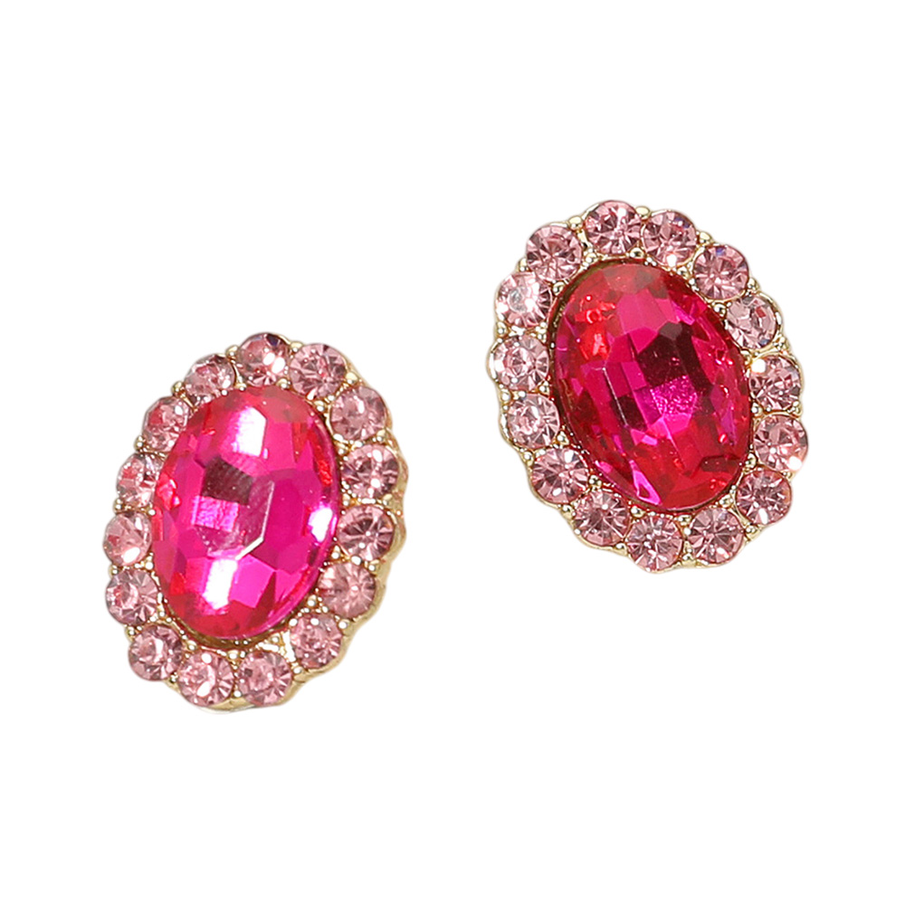 Details • Size : 0.7" X 0.8" • Post Back • Chic oval stud earrings featuring a vibrant crystal centerpiece surrounded by sparkling pink accents. Lightweight and radiant, they add a touch of glamour to casual outfits or evening looks. Perfect for gifting or accessorizing, these earrings bring timeless style and elegance to any jewelry collection. • Lead and Nickel Compliant