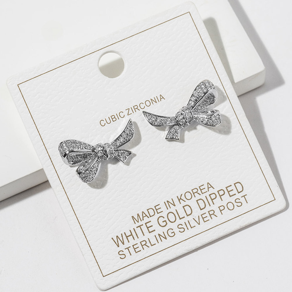 White Gold Dipped CZ Pave Bow Knot Stud Earrings