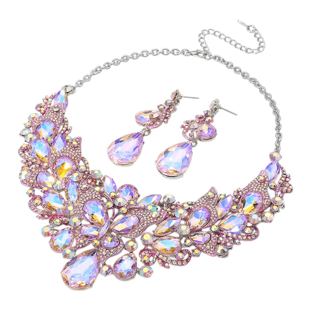 Details • Necklace Size : 21" + 4.25" L • Decor Size : 3" L • Earrings Size : 2.75" L • Turn heads with this butterfly crystal statement necklace and matching earrings set. Adorned with dazzling teardrop and floral accents, this bold jewelry set is perfect for weddings, galas, pageants, and formal events, adding radiant sparkle and elegance to your evening or bridal look.