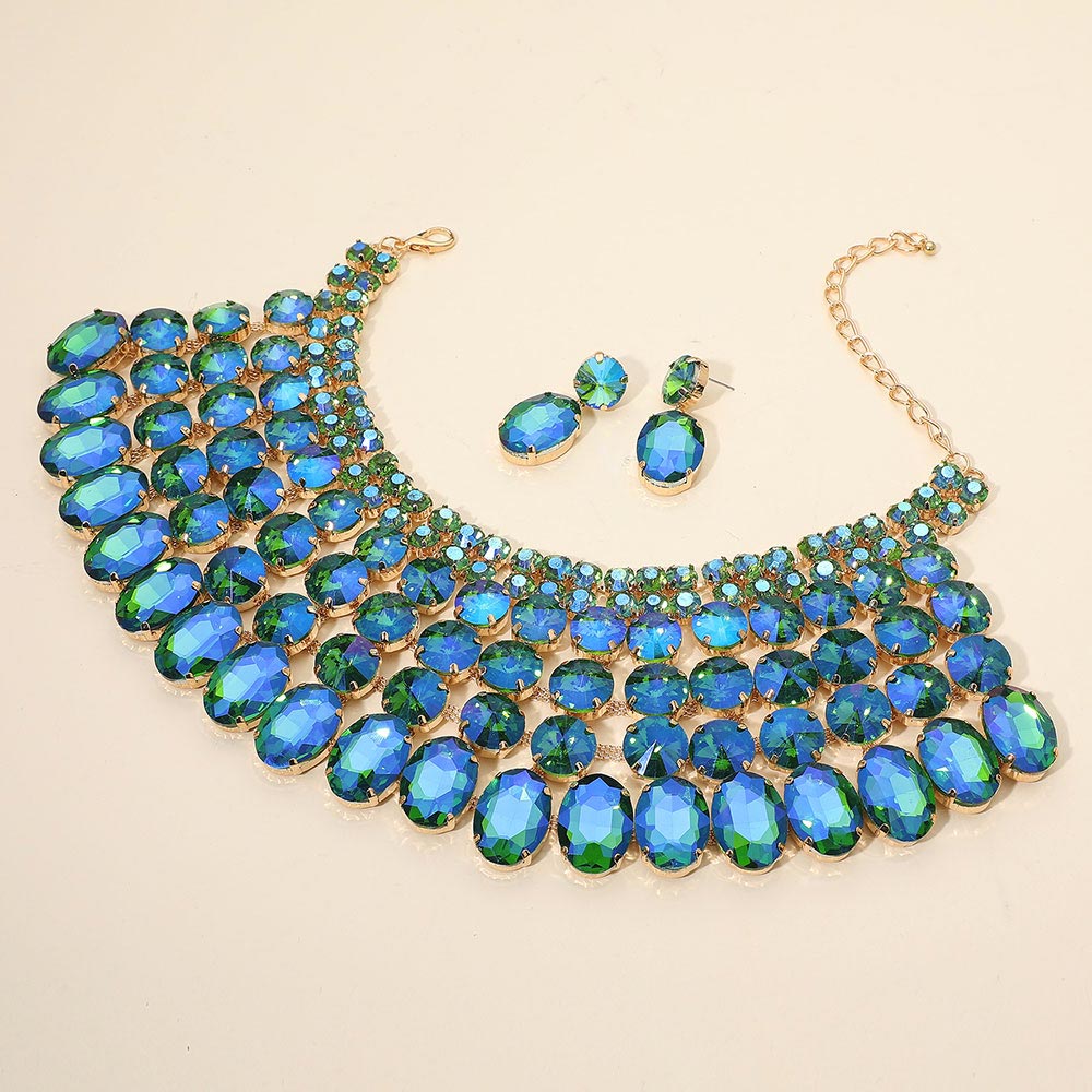 Details • Necklace Size: 13" + 4" L • Decor Size: 3.7" L • Earring Size: 1.75" L • Dramatic bib necklace and earring set featuring layered oval stones arranged in a bold cascading design. Perfect for weddings, galas, performances or any occasion that calls for standout glamour. An eye-catching accessory set that elevates formal and evening looks.