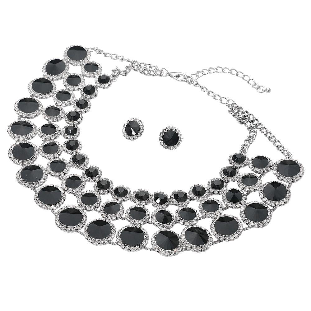 • Elegant statement necklace and earrings set featuring layered round-cut gems with dazzling shine. Perfect for parties, weddings, or evening events, this bold accessory adds glamour and sophistication to any outfit, making it a must-have for standout fashion styling.