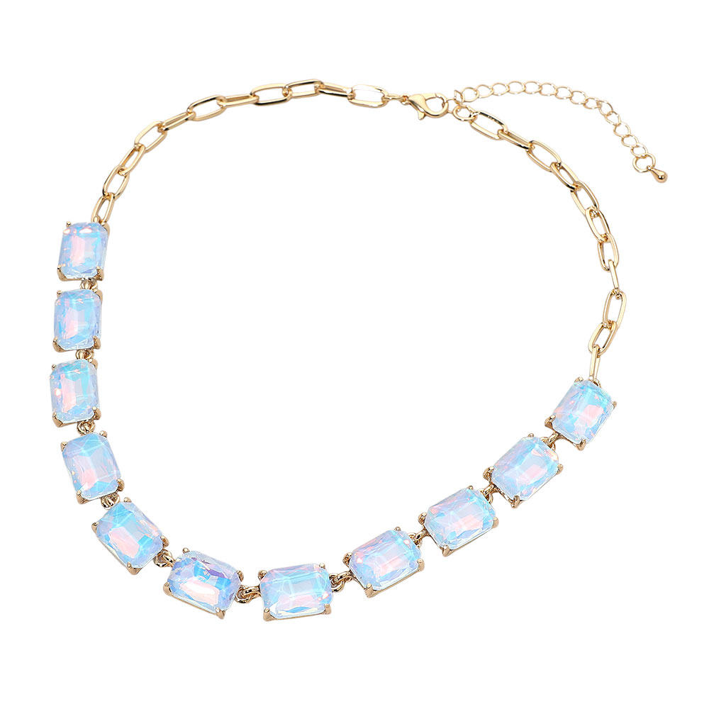 • This elegant gemstone chain necklace features a row of precisely cut stones linked with a sleek chain for a refined, modern look. Its adjustable closure ensures a comfortable fit, making it a sophisticated accessory for formal occasions, evening wear, or adding a statement touch to everyday style.