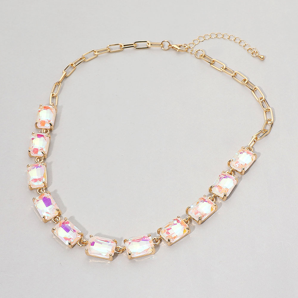 • This elegant gemstone chain necklace features a row of precisely cut stones linked with a sleek chain for a refined, modern look. Its adjustable closure ensures a comfortable fit, making it a sophisticated accessory for formal occasions, evening wear, or adding a statement touch to everyday style.