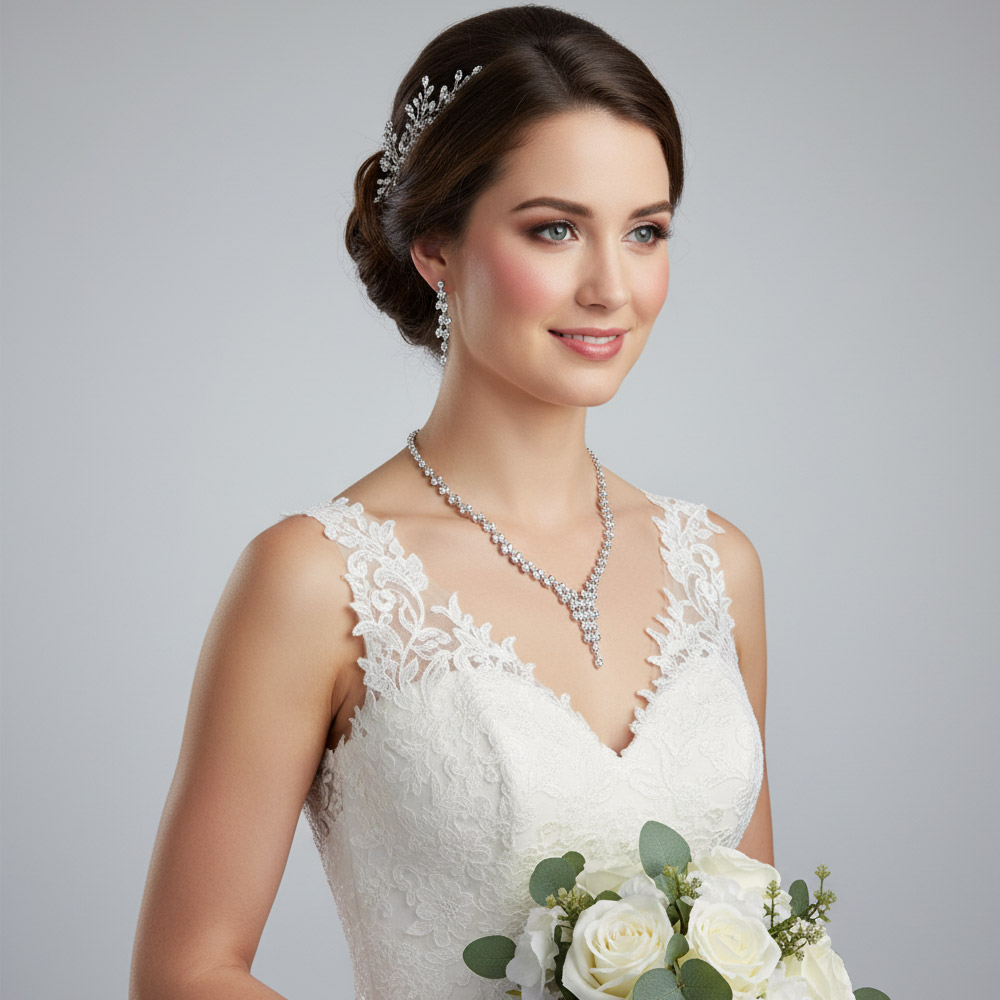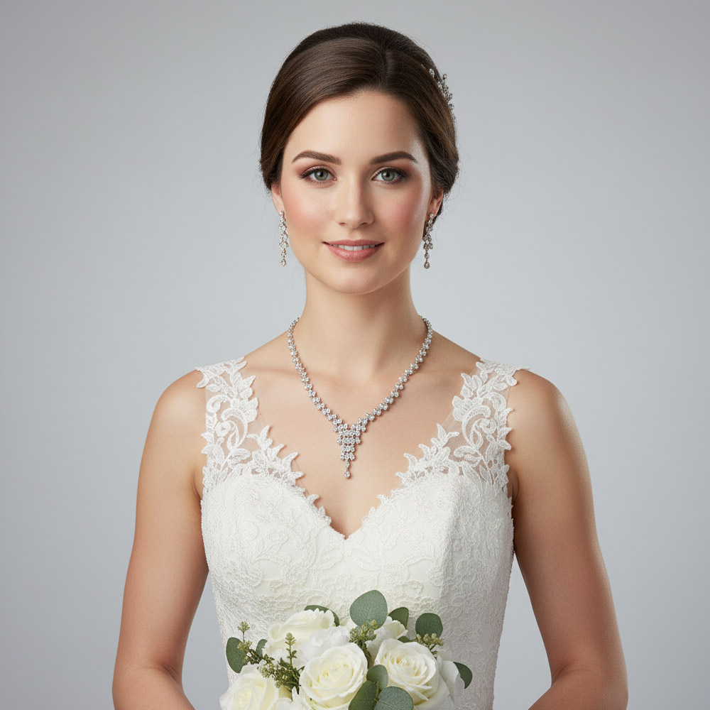 Details • Necklace Size : 16" + 3" L • Decor Size : 1.5" L • Earring Size : 1.5" L • Exuding elegance and timeless beauty, this crystal V-shaped necklace with matching earrings creates a striking silhouette. Designed to add brilliance and sophistication, it’s the perfect accessory for formal occasions, evening events, or enhancing your bridal and gala looks. • CZ Cubic Zirconia • Lead and Nickel Compliant