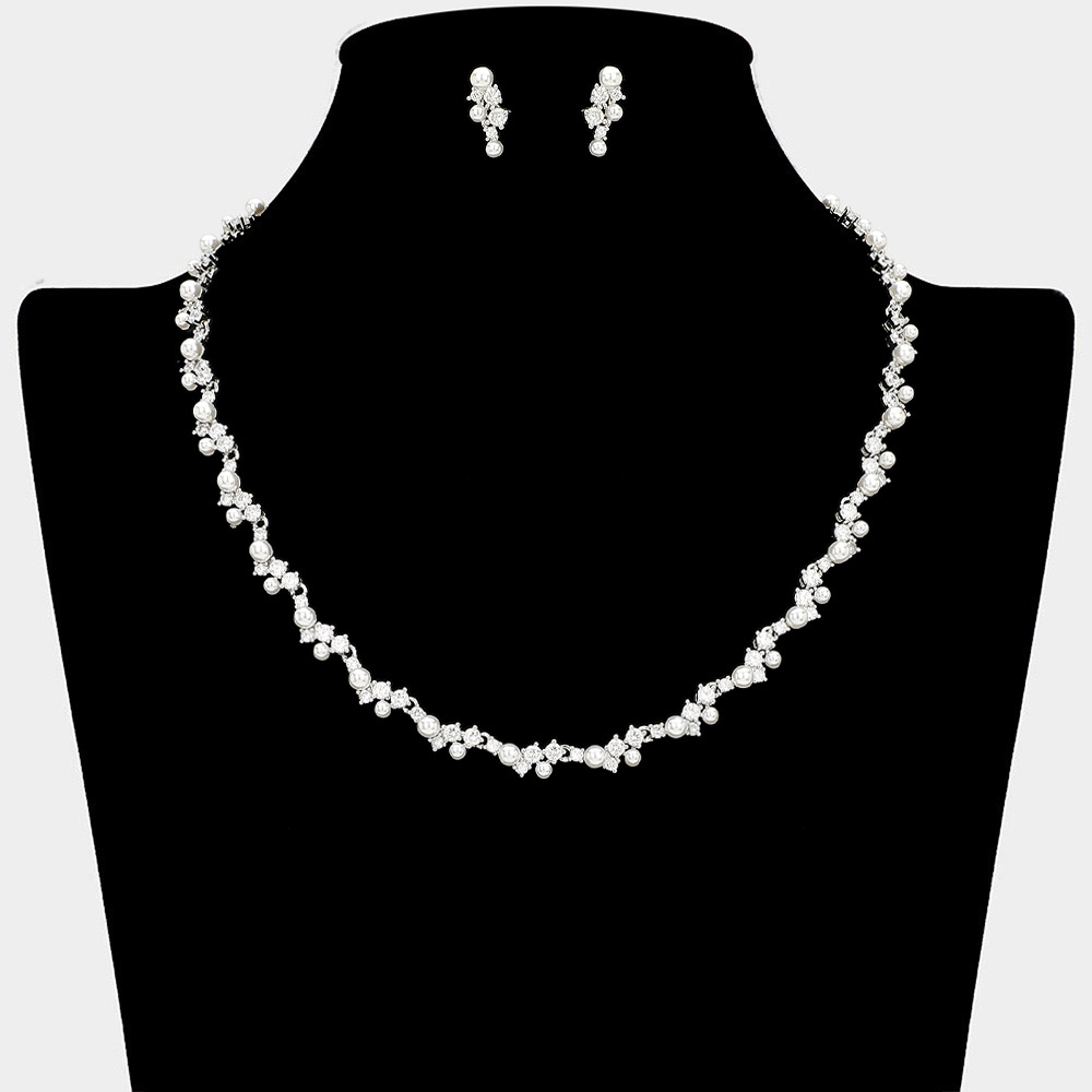 Details • Necklace Size : 17" + 0.25" L • Earrings Size : 0.7" L • Chic cz cluster necklace and earring set featuring round accents arranged along a graceful chain. The subtle clustered shape adds refined texture and sparkle, making it ideal for weddings, evening events, and formal occasions. • CZ Cubic Zirconia • Lead and Nickel Compliant