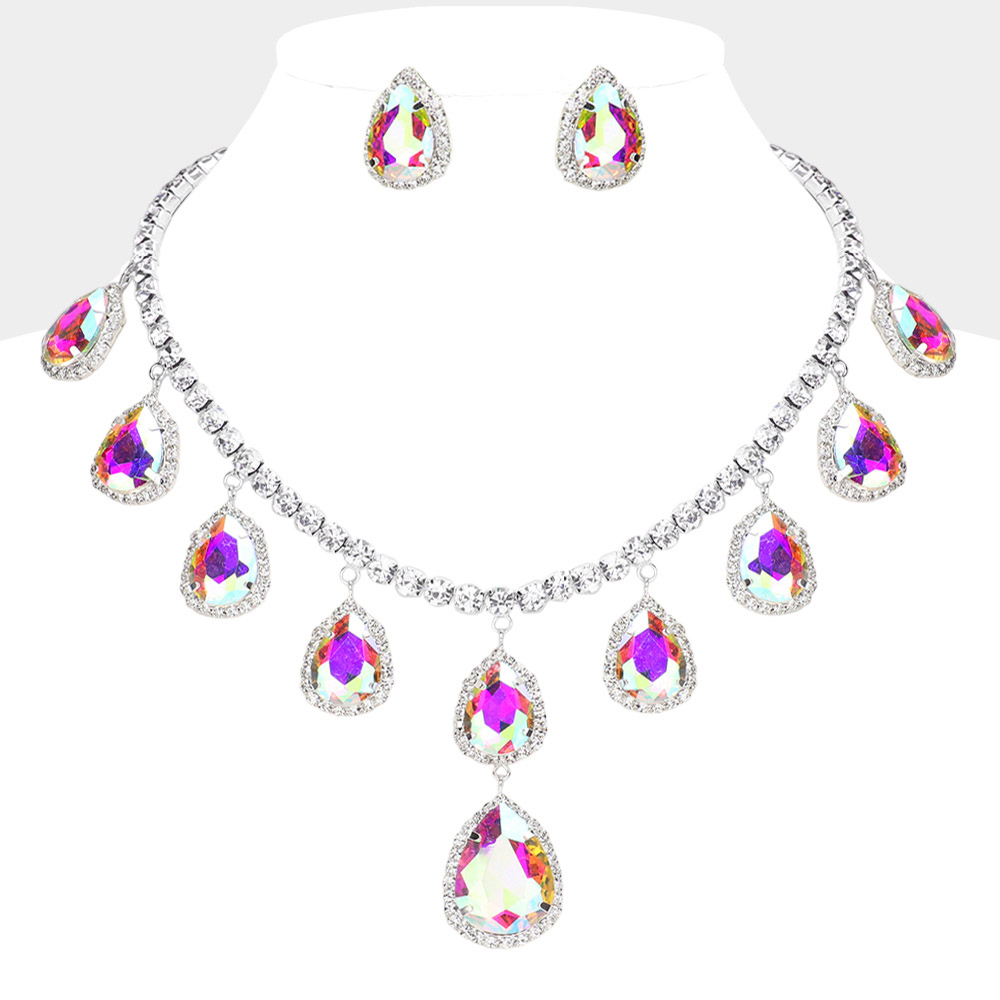 Teardrop Glass Stone Cluster Station Evening Necklace