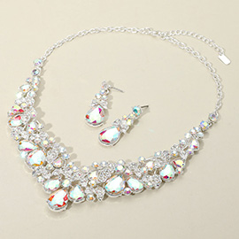 Details • Necklace Size : 19" + 3" L • Decor Size : 1.7" L • Earrings Size : 1.8" L • Striking jewelry set featuring a bold statement necklace with matching teardrop earrings. Designed with clustered gem accents for a luxurious and elegant look. Perfect for evening events, parties, or formal occasions, adding a touch of glamour and sophistication to any outfit.