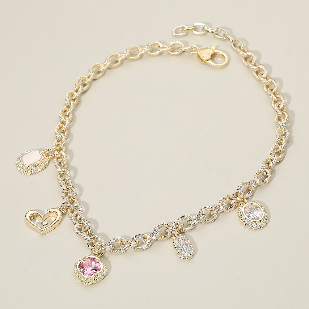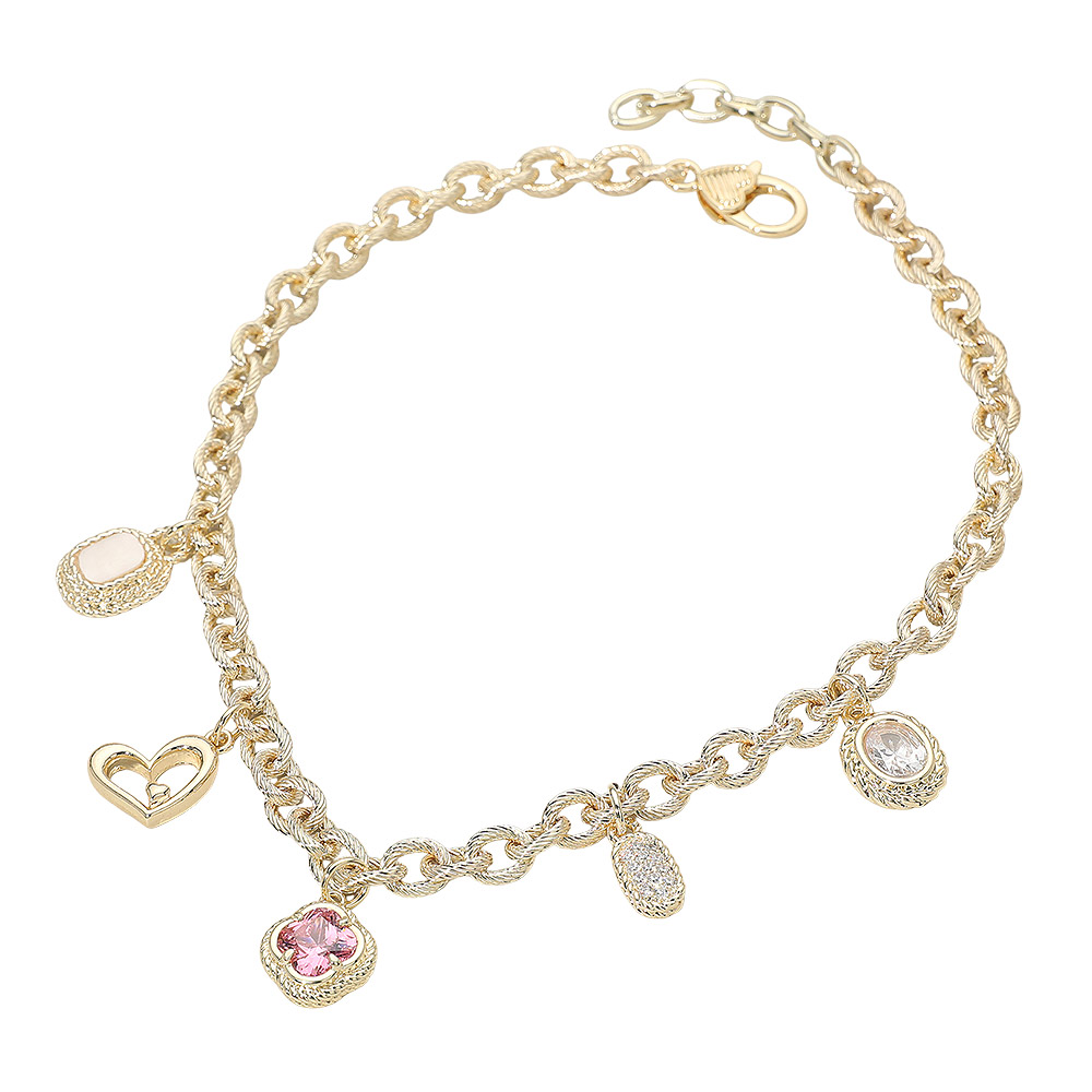 Details • Necklace Size : 17.5" + 2" L • Decor Size : 1.4" L • Delicate charm necklace featuring a classic link chain adorned with mixed dangle accents, including heart, oval, and quatrefoil gemstone-style drops. A stylish piece that adds movement and sparkle to any look, perfect for layering or wearing solo for an elegant touch. • Gold Dipped • CZ Cubic Zirconia