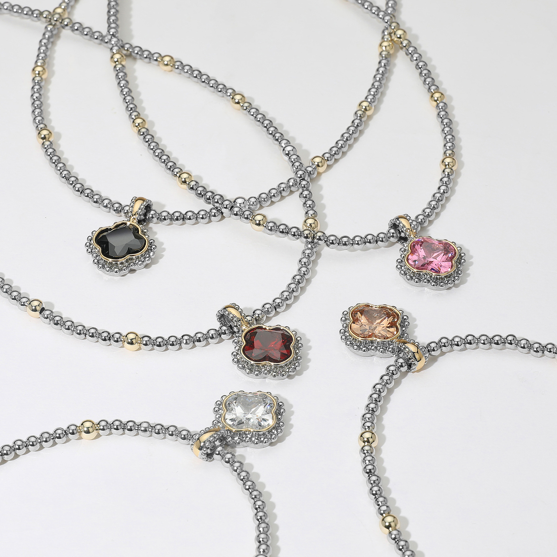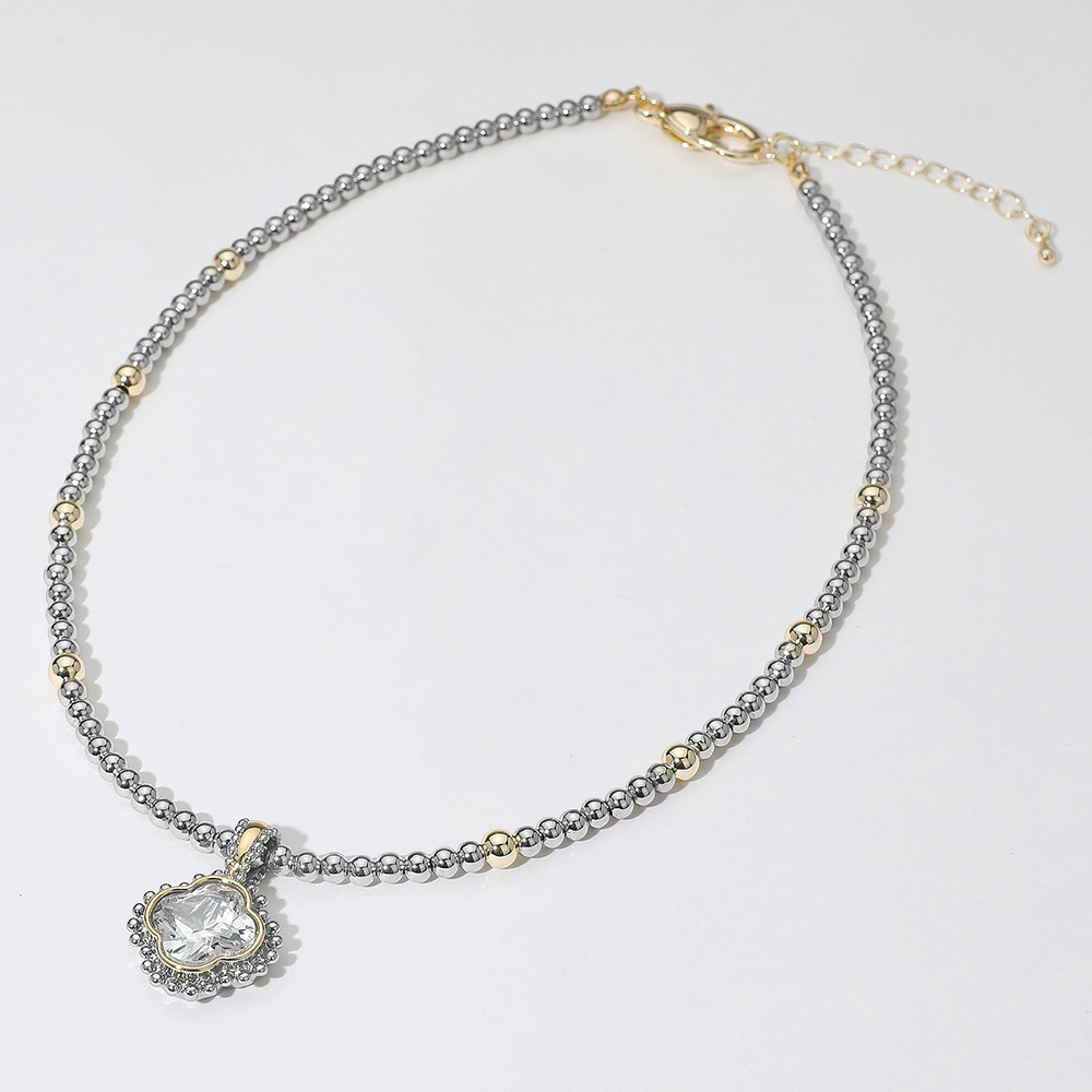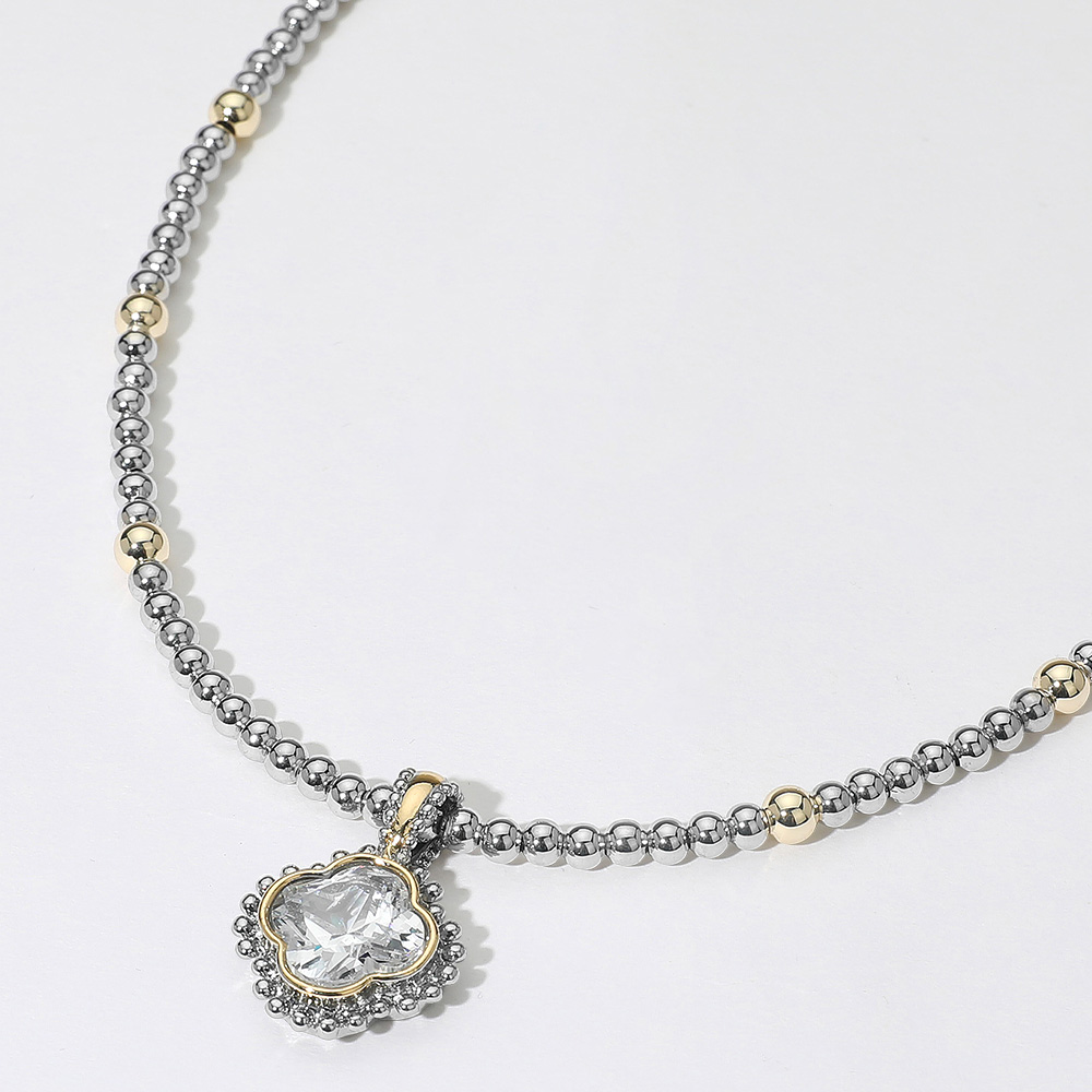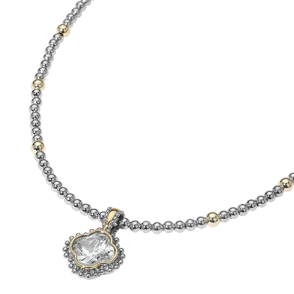 14K Gold Plated CZ Quatrefoil Pendant Accent Two Tone Ball Beaded Necklace