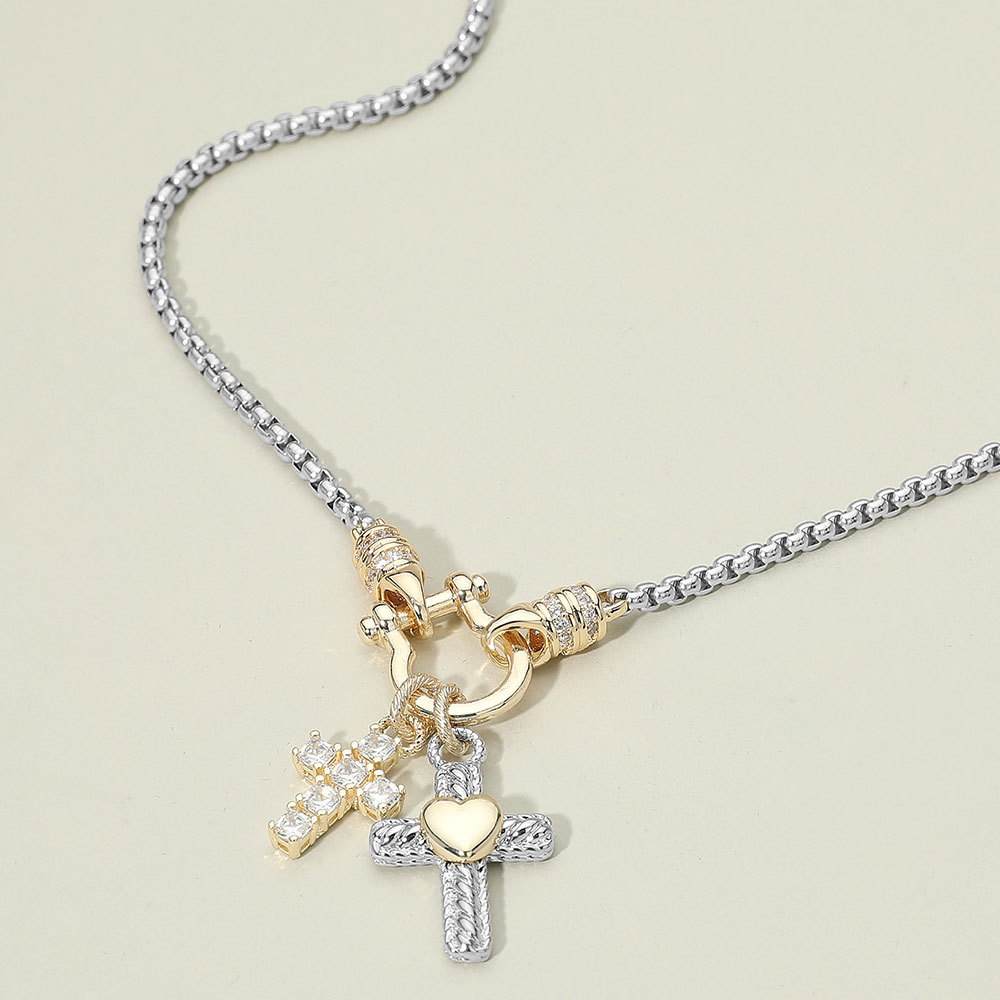 Details • Necklace Size : 18" + 2" L • Pendant Size : 2" L • Elegant chain necklace featuring cross and heart charms accented with sparkling details. Designed with a secure clasp, this meaningful accessory blends faith and style, making it a versatile addition to any jewelry collection. • CZ Cubic Zirconia • Gold Dipped