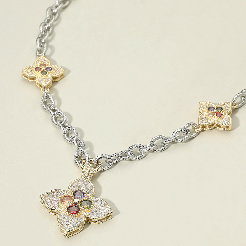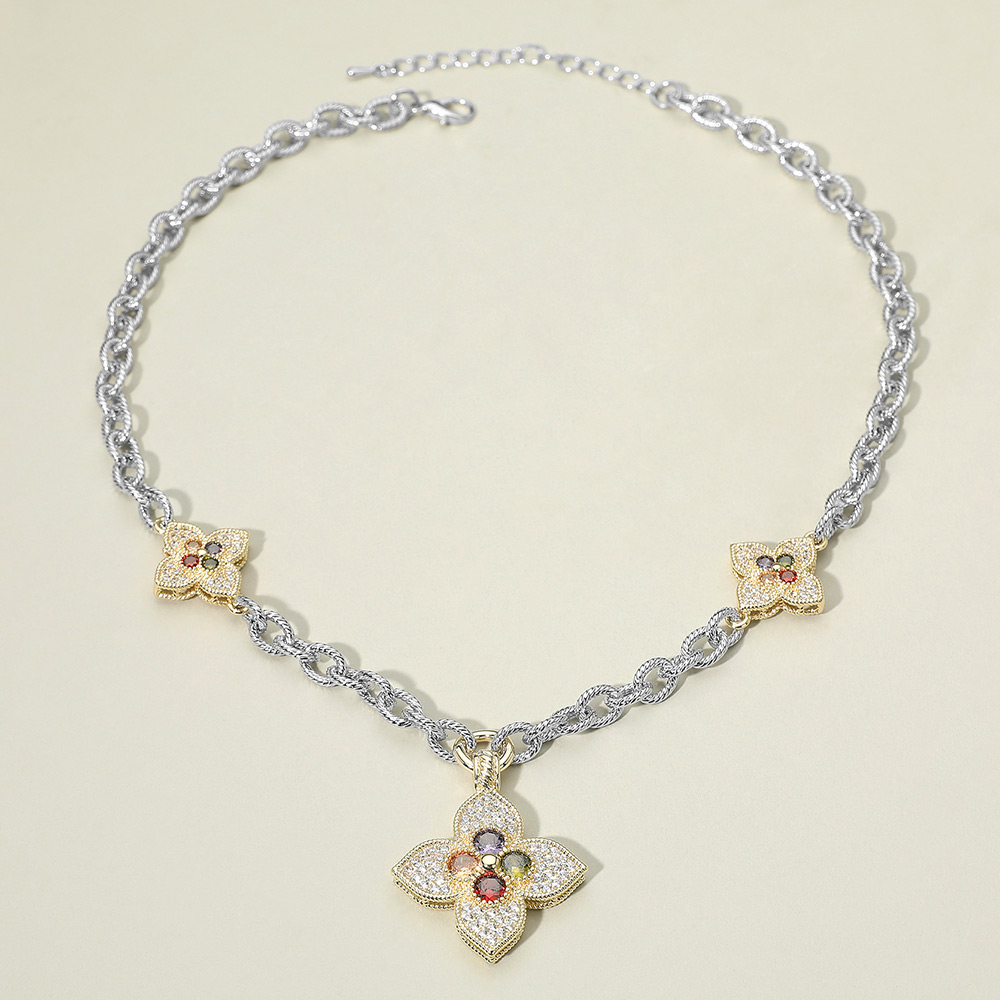 Details • Necklace Size : 16.75" + 2.25" L • Decor Size : 0.75" L • Pendant Size : 1.25" X 1.5" • Add sophistication to your style with this two-tone floral necklace featuring sparkling crystal details and vibrant multi-stone accents. Perfect for evening wear, special events, or as a thoughtful gift, it blends timeless elegance with a modern statement look. • CZ Cubic Zirconia • Gold Dipped