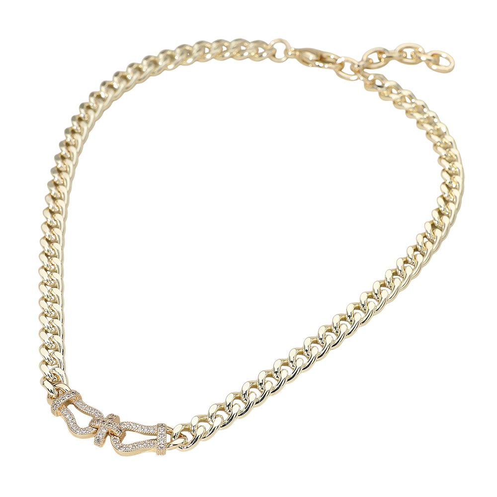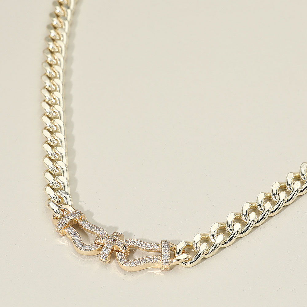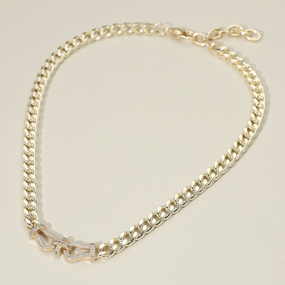 Details • Necklace Size : 18" + 2" L • Decor Size : 0.5" L • Elevate your look with this elegant chain link necklace featuring a refined crystal-accented clasp detail. The bold yet timeless design exudes sophistication, making it a versatile accessory for both day and night. Perfect for layering or wearing solo for a polished statement finish. • CZ Cubic Zirconia • Gold Dipped