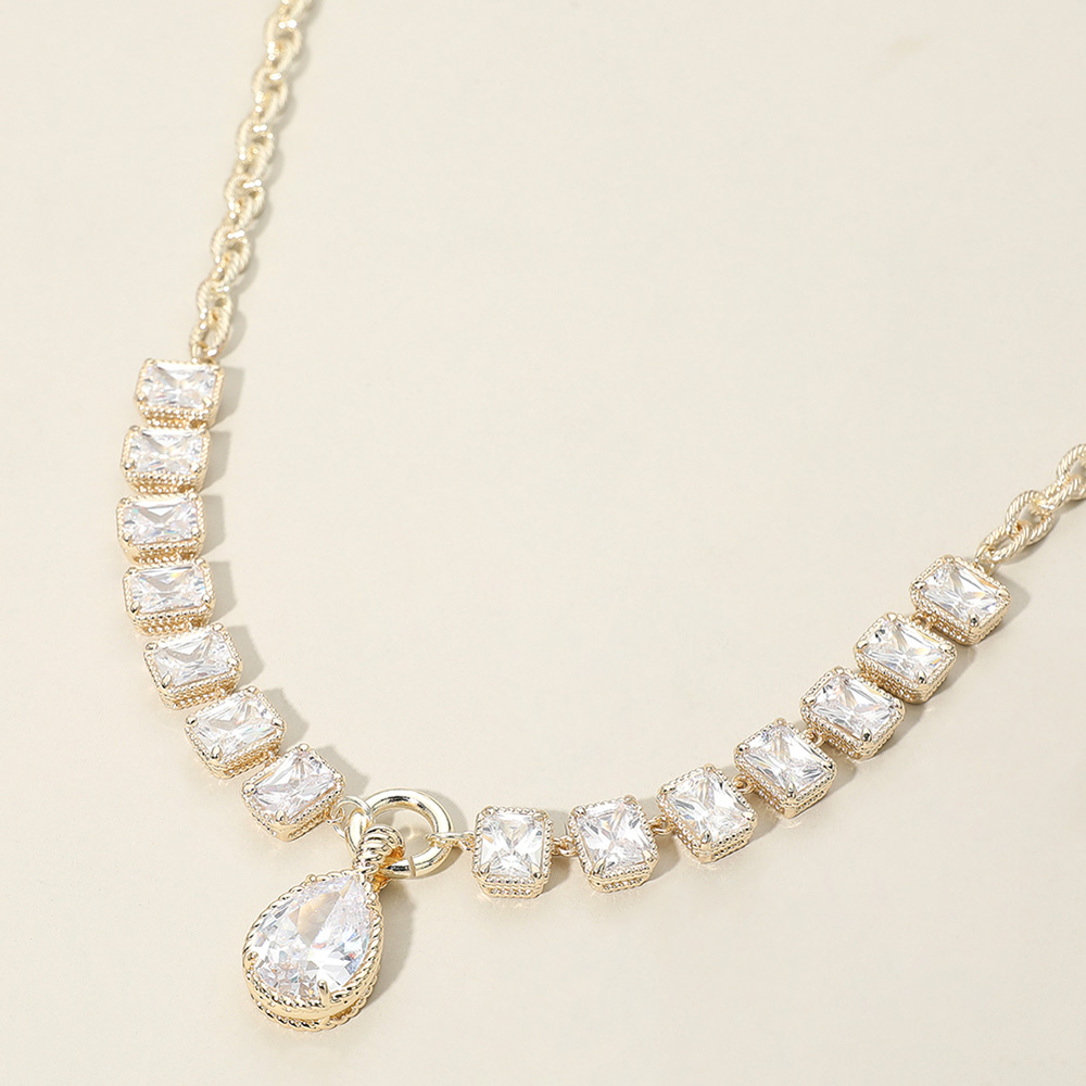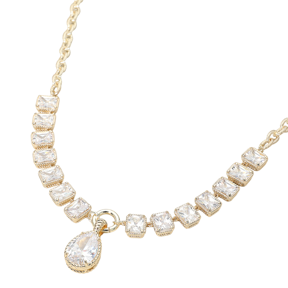 Details • Necklace Size : 17.5" + 2" L • Decor Size : 0.4" L • Pendant Size : 0.6" X 1.3" • Add show-stopping brilliance to your look with this radiant statement necklace featuring a row of cushion-cut stones and a pear-shaped drop charm. Its refined detailing and elegant sparkle make it perfect for special occasions or elevating everyday style with a touch of luxe sophistication. • CZ Cubic Zirconia • Gold Dipped