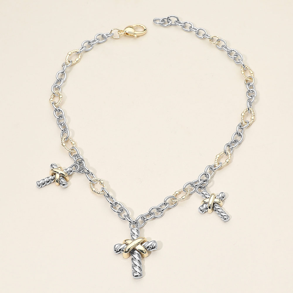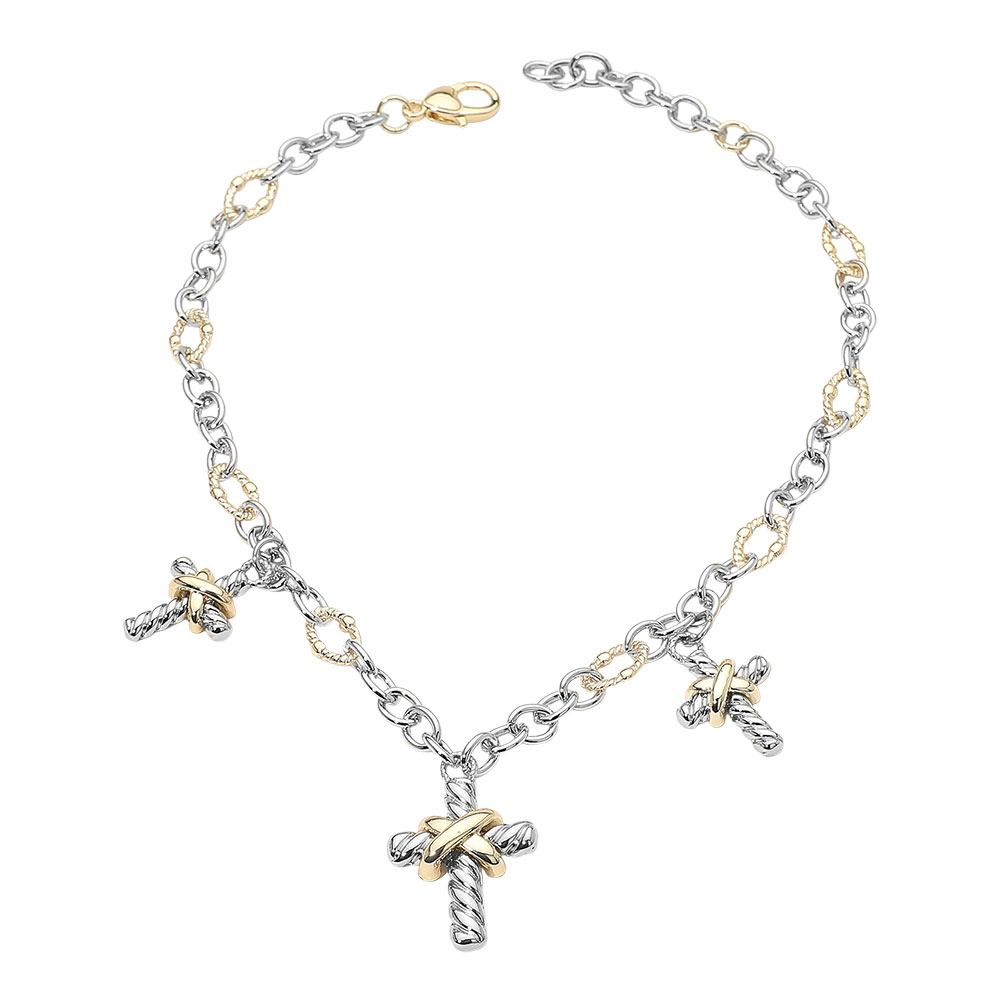 Details • Necklace Size : 15.5" + 3" L • Decor Size : 1.5" L • This two-tone chain necklace features intricately designed cross charms that blend modern edge with timeless symbolism. Its versatile design makes it ideal for both casual and refined looks, adding a subtle statement of faith and contemporary elegance to any style. • Gold Dipped