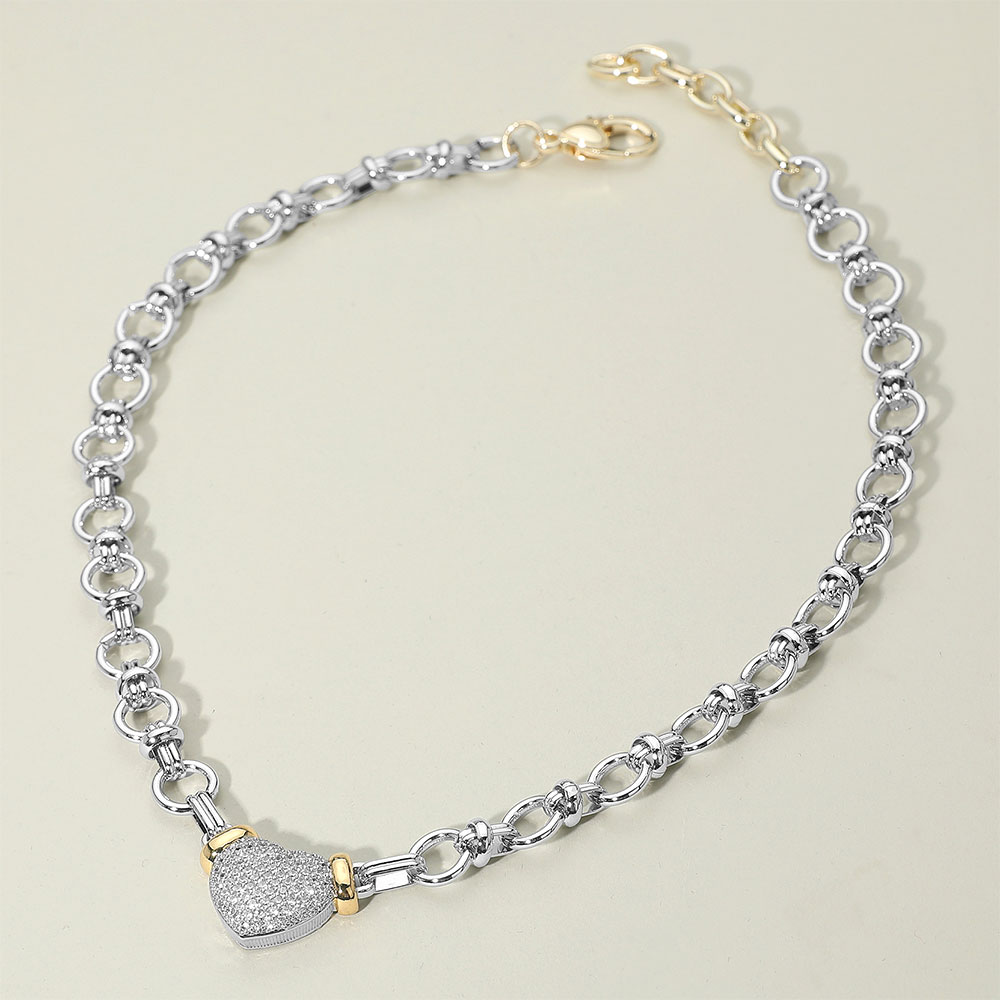 Details • Necklace Size : 17" + 1" L • Decor Size : 0.75" L • Elegant two-tone necklace featuring a sparkling pave heart pendant on a unique looped chain. A versatile statement piece that blends modern design with timeless elegance, perfect for both daily wear and special occasions. • CZ Cubic Zirconia • Gold Dipped