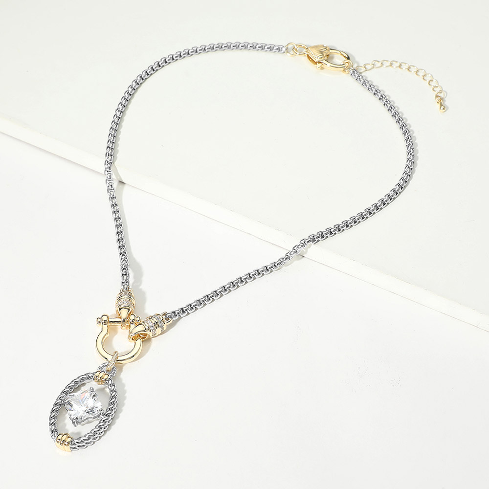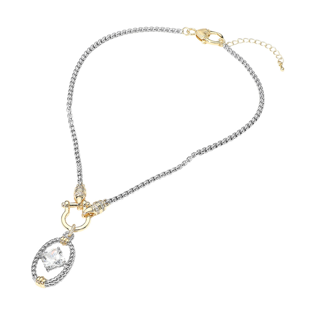 Oval CZ Stone Pendant Pointed 14K Gold Plated Two Tone Chunky Chain Necklace