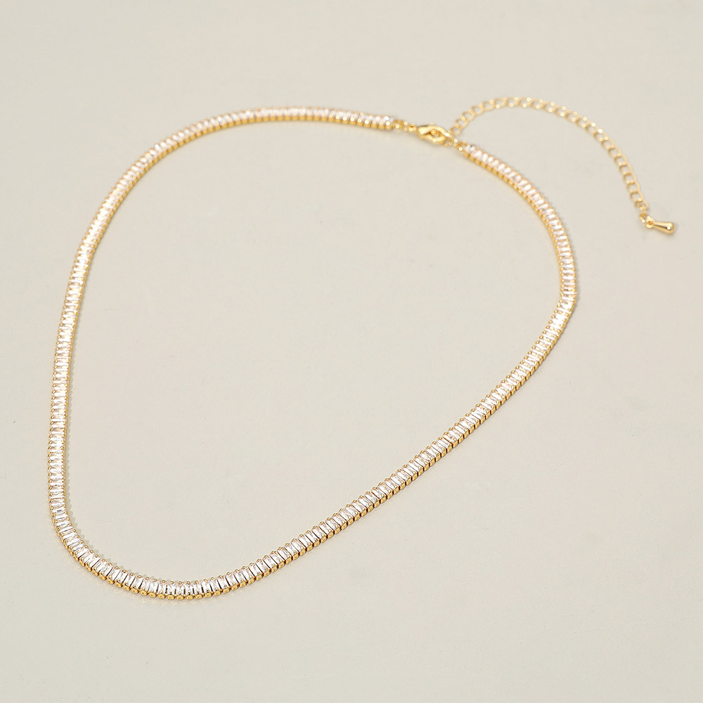 Details • Necklace Size : 16" + 3" L • Decor Size : 0.2" L • Sophisticated tennis necklace featuring sleek baguette-cut crystals for a refined, modern shine. Perfect for formal events or elevating everyday looks, offering timeless beauty and elegance. A luxurious jewelry piece that adds radiant sparkle and style to any outfit effortlessly. • Gold Dipped • Lead and Nickel Compliant