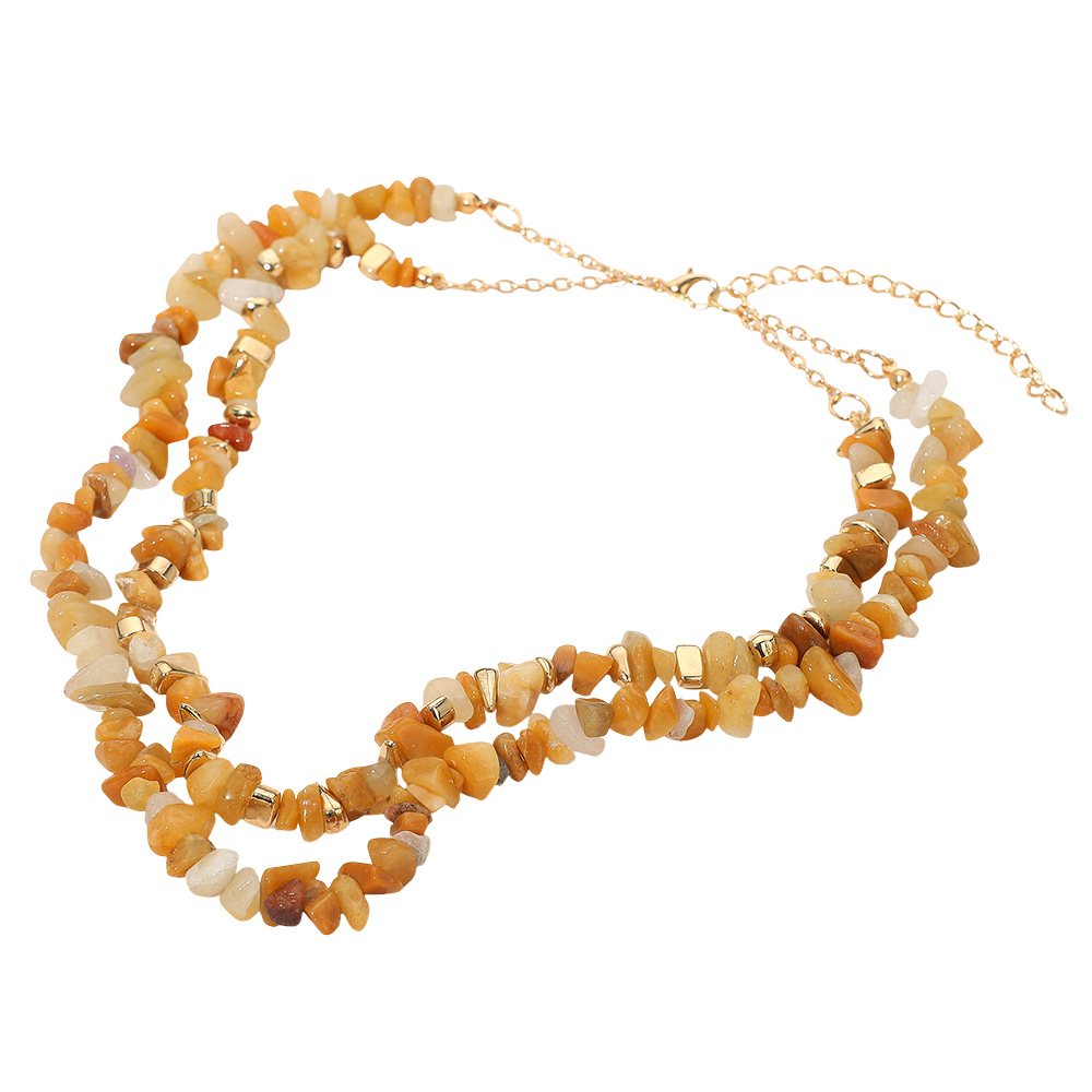 Details • Necklace Size : 15.75" + 3" L • Decor Size : 2" L • Layered chip bead necklace featuring irregular natural stone pieces and metallic accents. Designed with an adjustable clasp, this bold statement piece adds earthy elegance and texture to both casual and dressy outfits. • Gold Dipped • Lead and Nickel Compliant