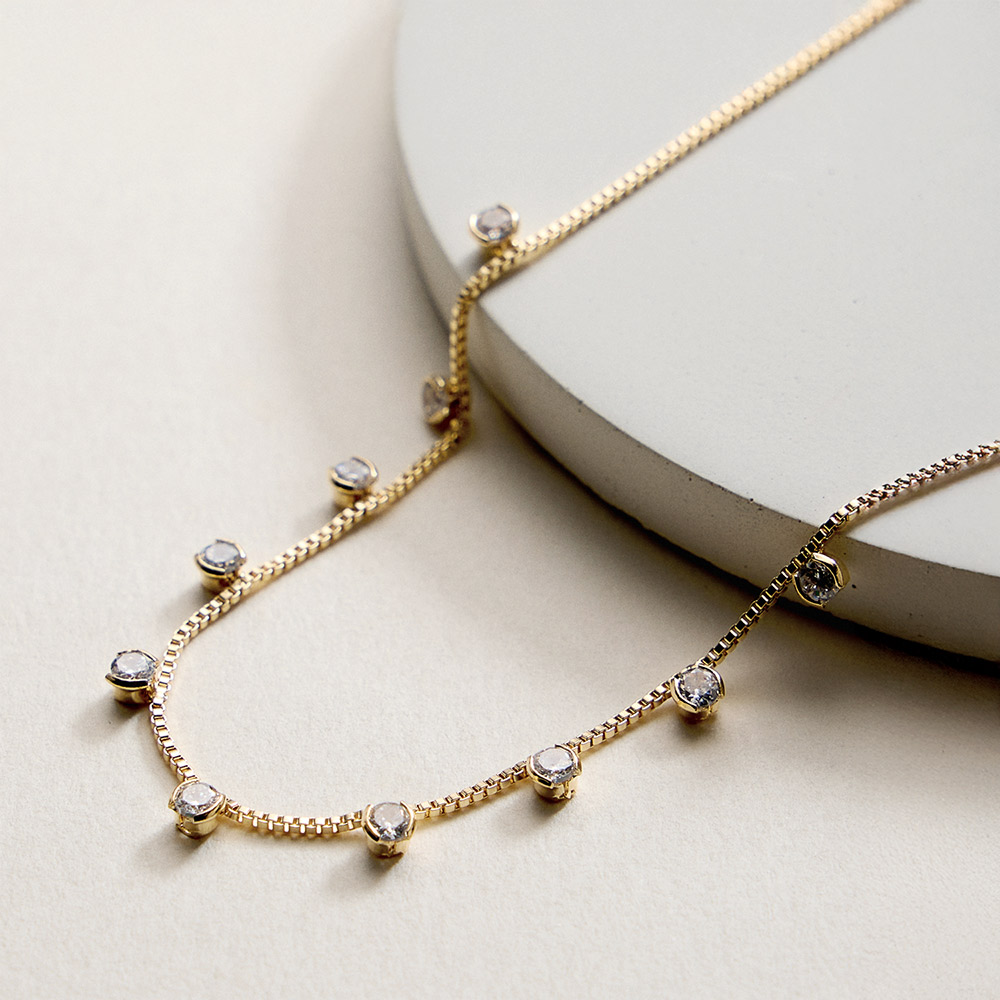 Details • Necklace Size : 14.25" + 4" L • Decor Size : 0.1" L • This station drop accent chain necklace showcases evenly spaced charm details along a sleek, refined silhouette for a balanced and elegant look. Designed for effortless layering or solo styling, it adds subtle movement and shine, making it a versatile choice for everyday wear, gifting, and curated boutique jewelry collections. • CZ Cubic Zirconia • Gold Dipped • Hypoallergenic • Lead and Nickel Compliant • Made In Brazil