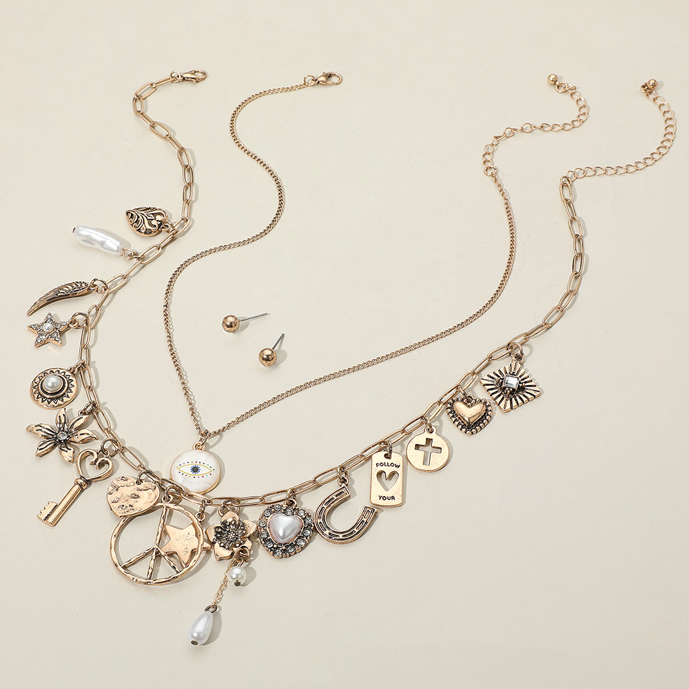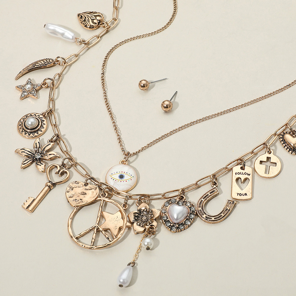 2PCS - Evil Eye Stone Paved Mother of Pearl Disc Pendant Boho Peach Pearl Star Heart Key Charm Station Paperclip Chain Necklaces