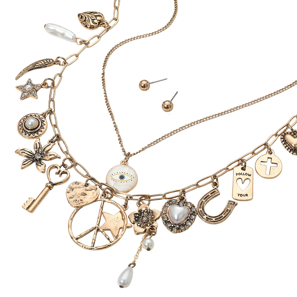 CZ Stone Paved Heart Brass Metal Key LOVE Charm Layered Necklace