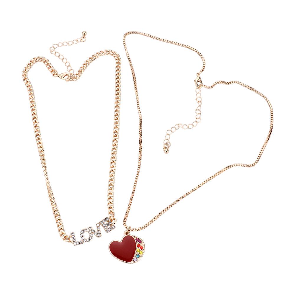 2PCS - Rhinestone Embellished Metal LOVE Message Enamel Heart Pendant Necklaces