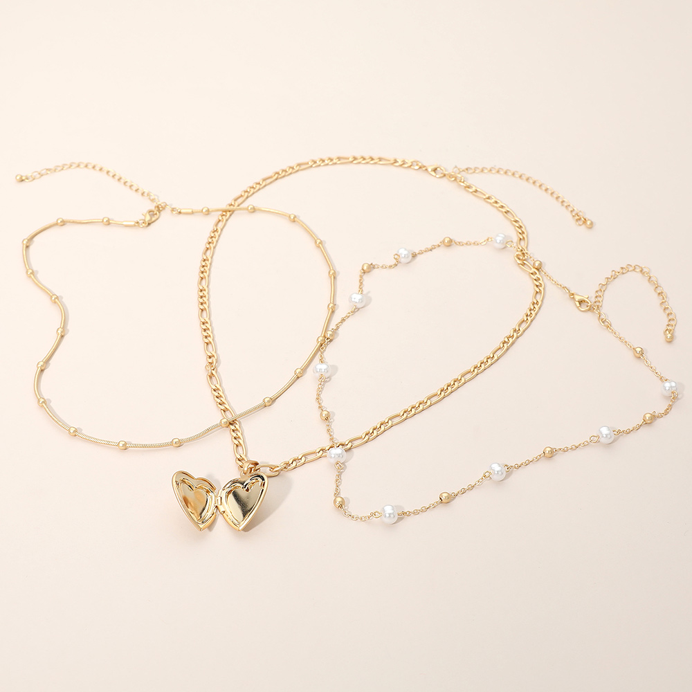 3PCS - Heart Locket Pendant Pearl Station Bead Chain Layered Necklaces