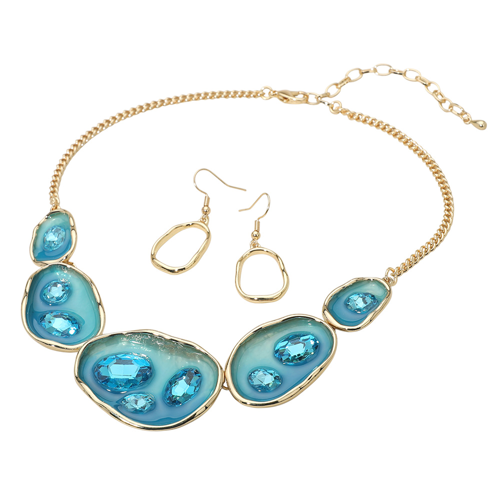 Details • Necklace Size : 16" + 3.25" L • Decor Size : 1.3" L • Earrings Size : 1.6" L • Contemporary jewelry set featuring a bold necklace and matching earrings with artistic gem accents framed in fluid shapes. Perfect for parties, formal events, or chic everyday wear. A statement-making accessory that combines modern style with elegant sophistication. • Lead and Nickel Compliant