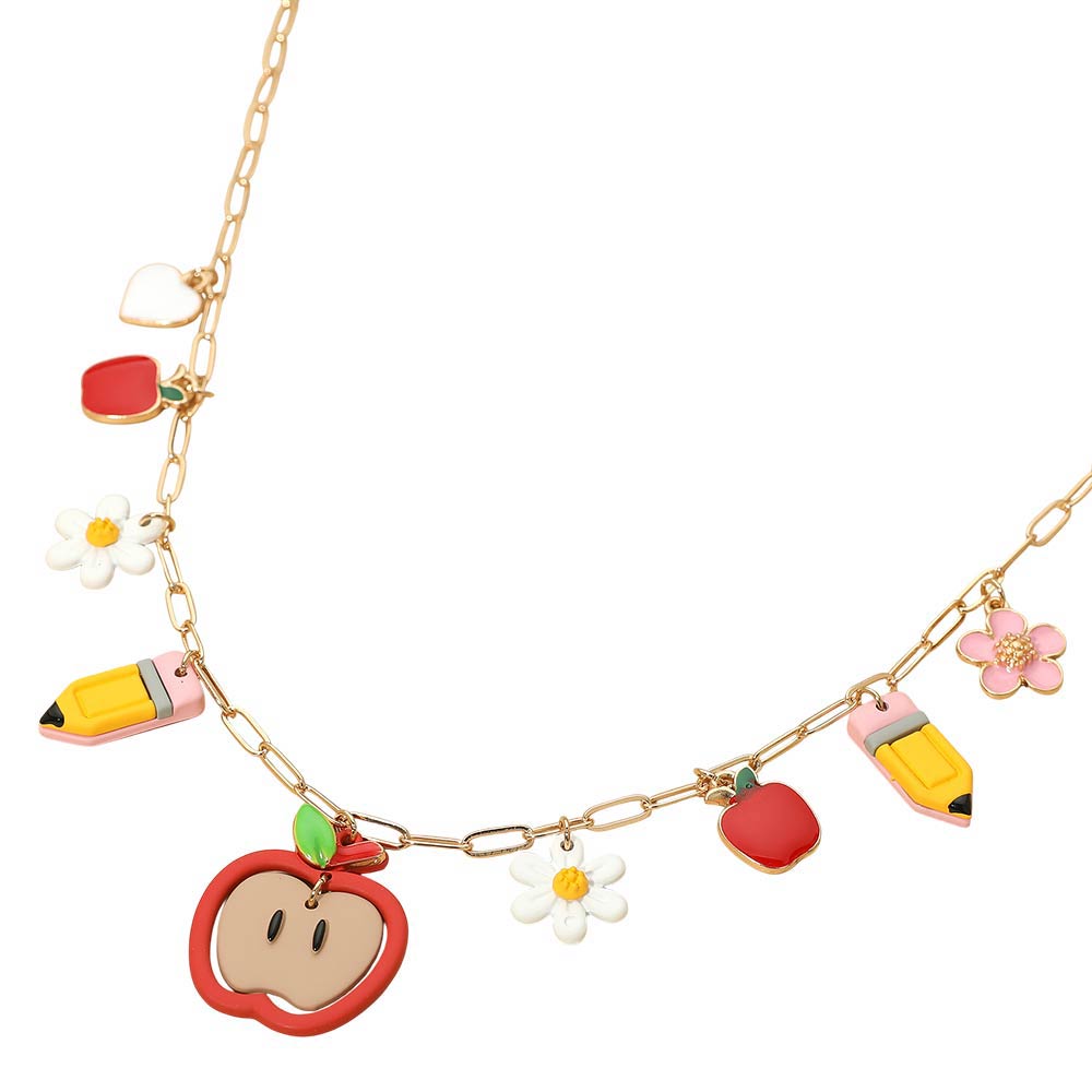 Details • Necklace Size : 16.25" + 3.25" L • Decor Size : 1.5" L • This playful charm accent necklace features a mix of whimsical motifs suspended along a delicate chain, creating a fun and expressive statement piece. Ideal for casual outfits, themed collections, and gift displays, it adds personality and movement while remaining lightweight and easy to layer for everyday or seasonal styling. • Lead and Nickel Compliant