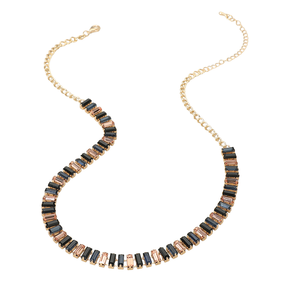 • This statement necklace features a sleek row of baguette style accents arranged along a classic chain for a refined yet eye catching look. Designed to elevate everyday outfits or complete evening styling, it offers a balanced blend of structure and shine. Ideal for layered looks, gift selections, and curated accessory assortments.