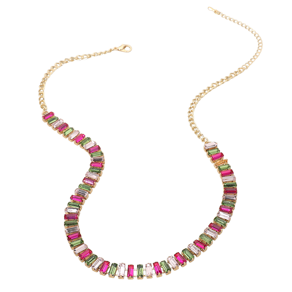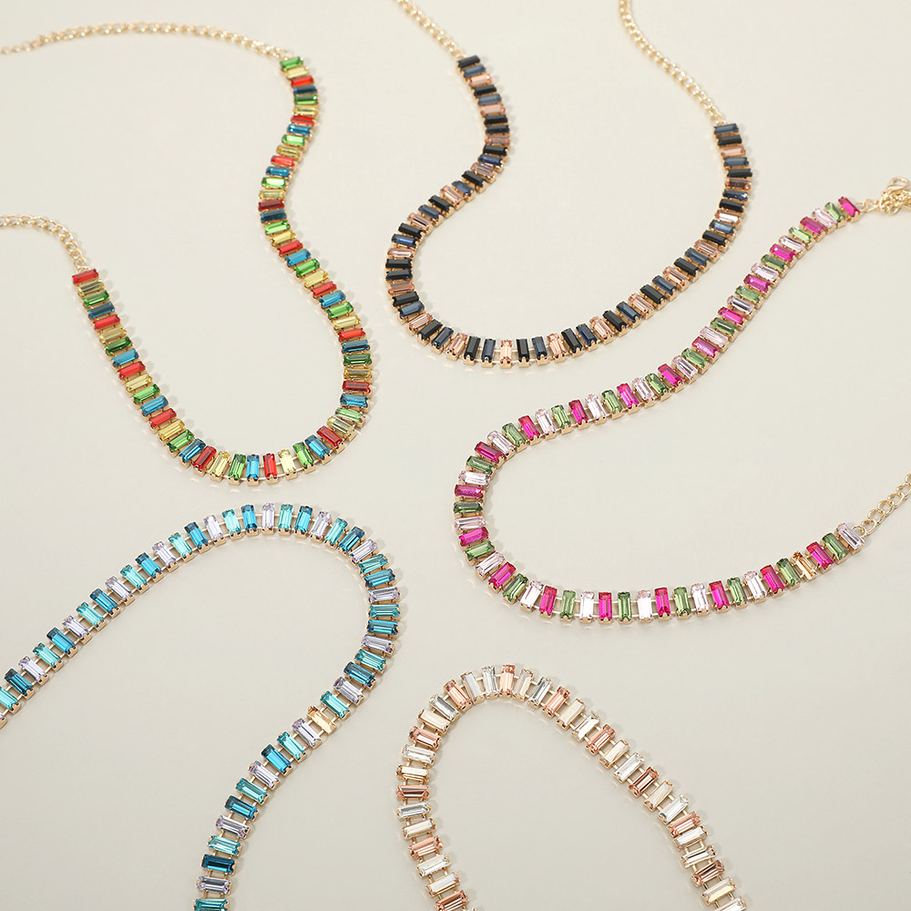 • This statement necklace features a sleek row of baguette style accents arranged along a classic chain for a refined yet eye catching look. Designed to elevate everyday outfits or complete evening styling, it offers a balanced blend of structure and shine. Ideal for layered looks, gift selections, and curated accessory assortments.
