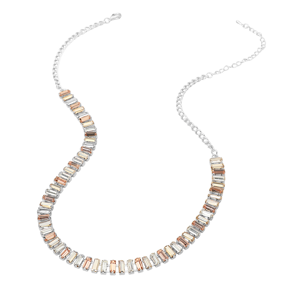 Details • Necklace Size : 18.25" + 3" L • Decor Size : 0.3" L • This statement necklace features a sleek row of baguette style accents arranged along a classic chain for a refined yet eye catching look. Designed to elevate everyday outfits or complete evening styling, it offers a balanced blend of structure and shine. Ideal for layered looks, gift selections, and curated accessory assortments. • Lead and Nickel Compliant