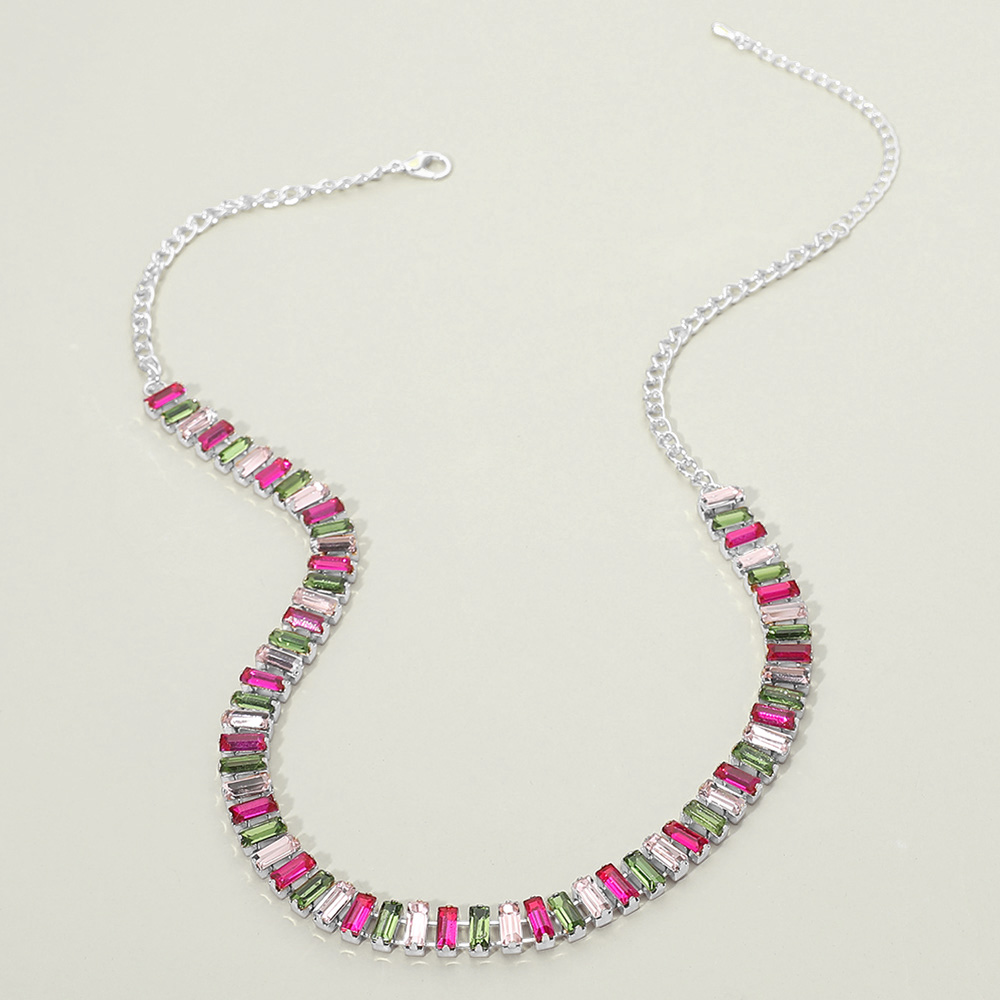 Details • Necklace Size : 18.25" + 3" L • Decor Size : 0.3" L • This statement necklace features a sleek row of baguette style accents arranged along a classic chain for a refined yet eye catching look. Designed to elevate everyday outfits or complete evening styling, it offers a balanced blend of structure and shine. Ideal for layered looks, gift selections, and curated accessory assortments. • Lead and Nickel Compliant