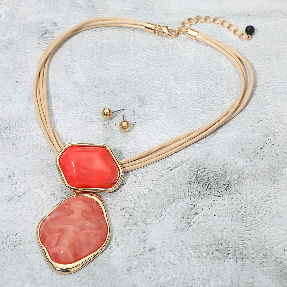 • Bold pendant necklace paired with coordinating stud earrings for a complete look. The unique layered design adds eye-catching detail, making this set perfect for elevating casual outfits or complementing evening attire with effortless elegance.