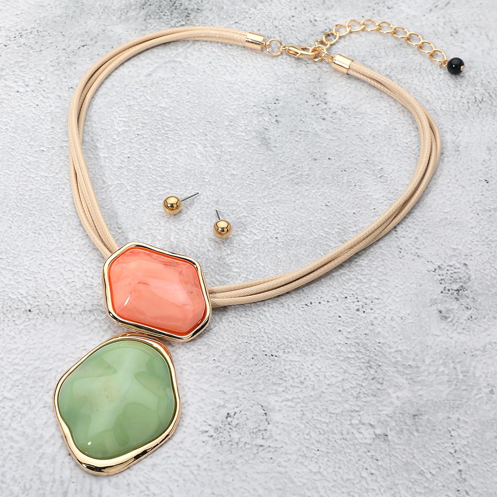 • Bold pendant necklace paired with coordinating stud earrings for a complete look. The unique layered design adds eye-catching detail, making this set perfect for elevating casual outfits or complementing evening attire with effortless elegance.
