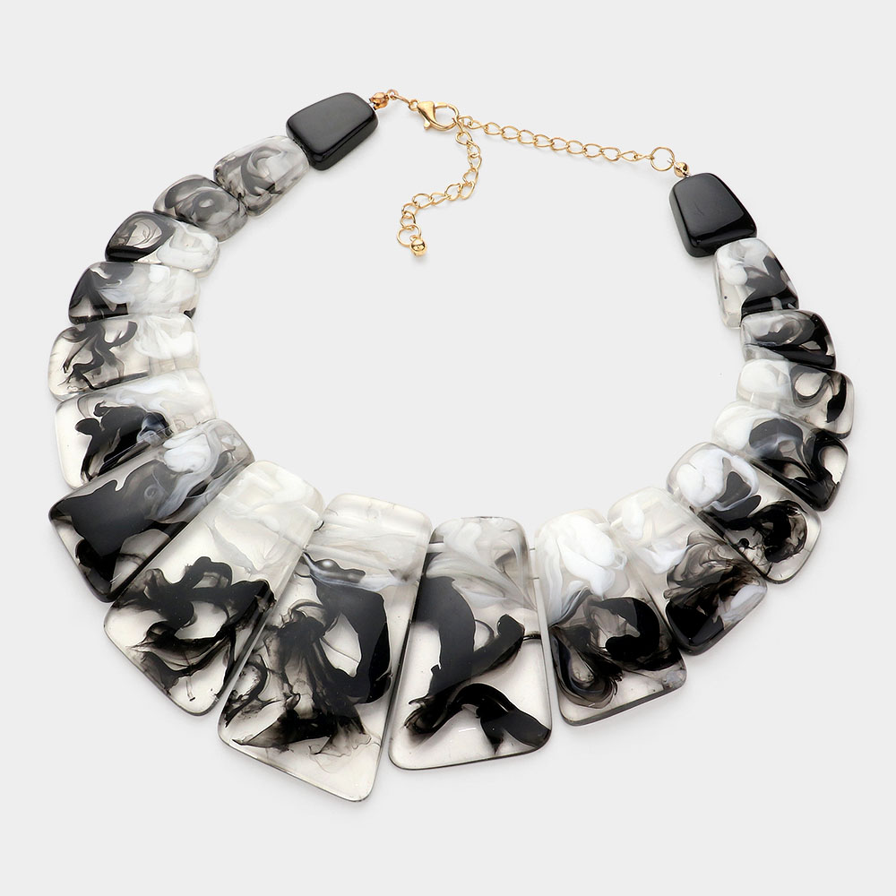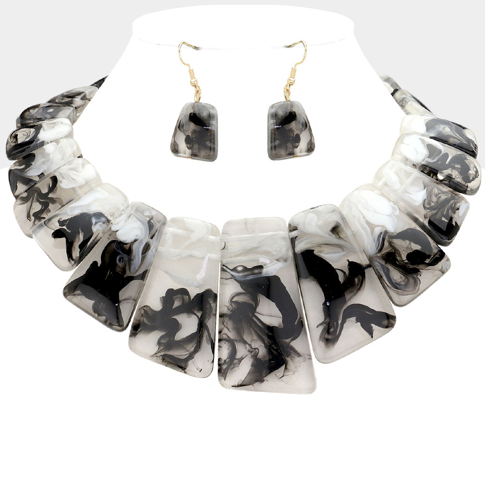 • Turn heads with this abstract statement necklace and earring set. Designed with bold, marbled panels that blend art and fashion, it offers a dramatic, sculptural effect that enhances any outfit—perfect for modern, confident looks that demand attention.