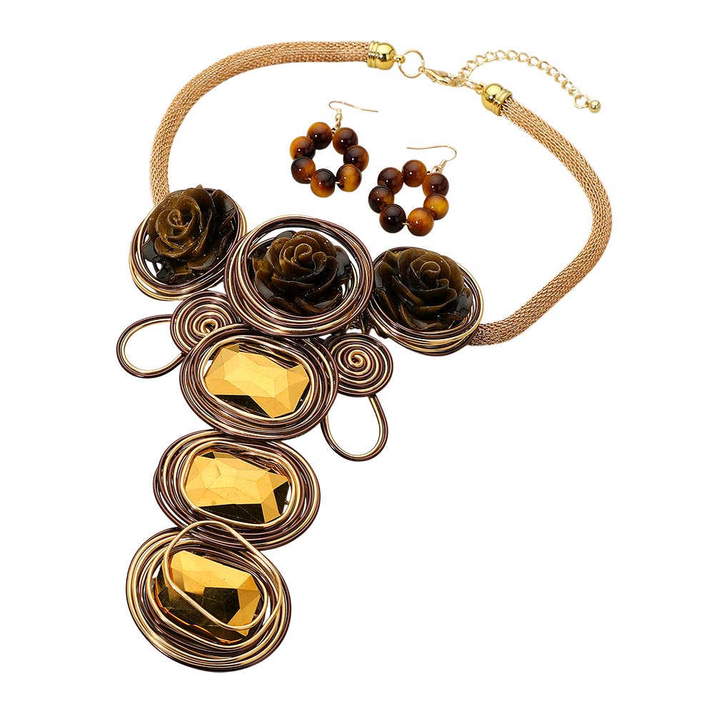 • This bold statement necklace and earring set showcases an artistic blend of floral motifs and faceted gem accents. Designed to stand out, it adds dramatic elegance and creative flair to any outfit, making it the perfect accessory for special events or evening glamour.