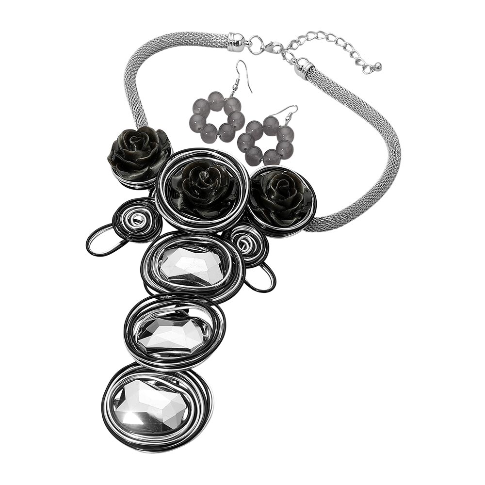 • This bold statement necklace and earring set showcases an artistic blend of floral motifs and faceted gem accents. Designed to stand out, it adds dramatic elegance and creative flair to any outfit, making it the perfect accessory for special events or evening glamour.