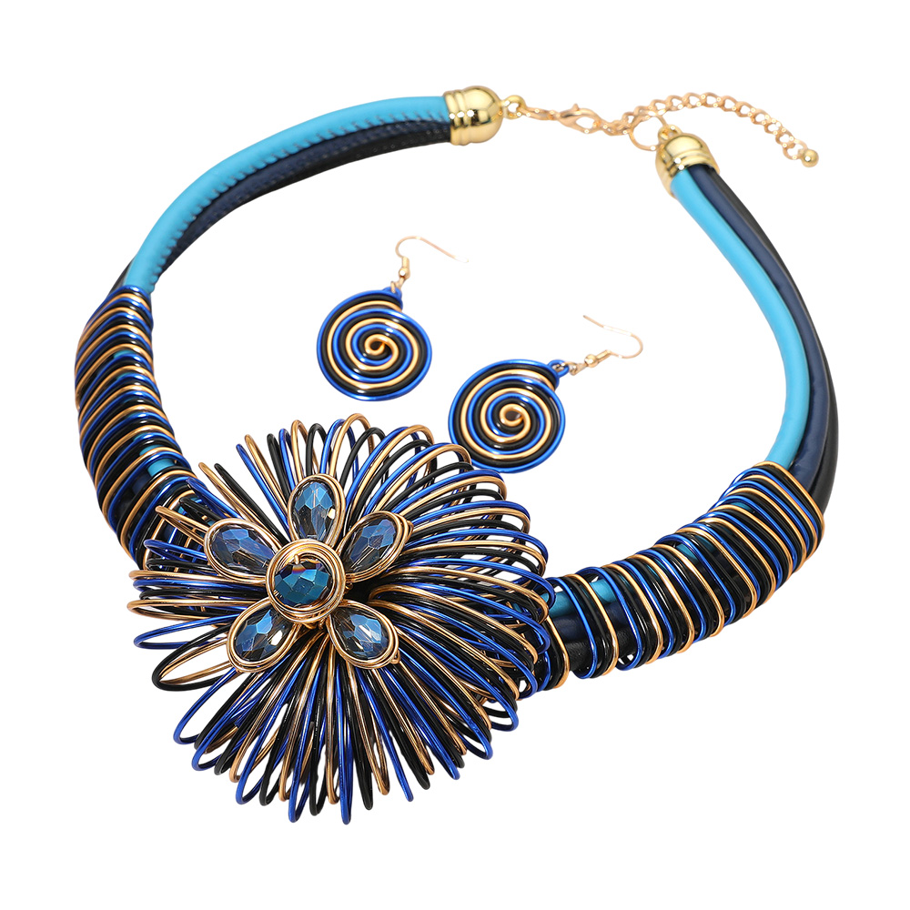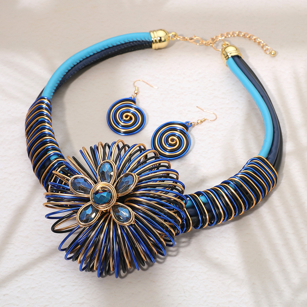 • Make a bold fashion statement with this exquisite necklace and earring set, featuring a large flower centerpiece with layered loops and crystal accents. Paired with spiral drop earrings, this set adds artistic flair and contemporary charm to any elegant or casual outfit.