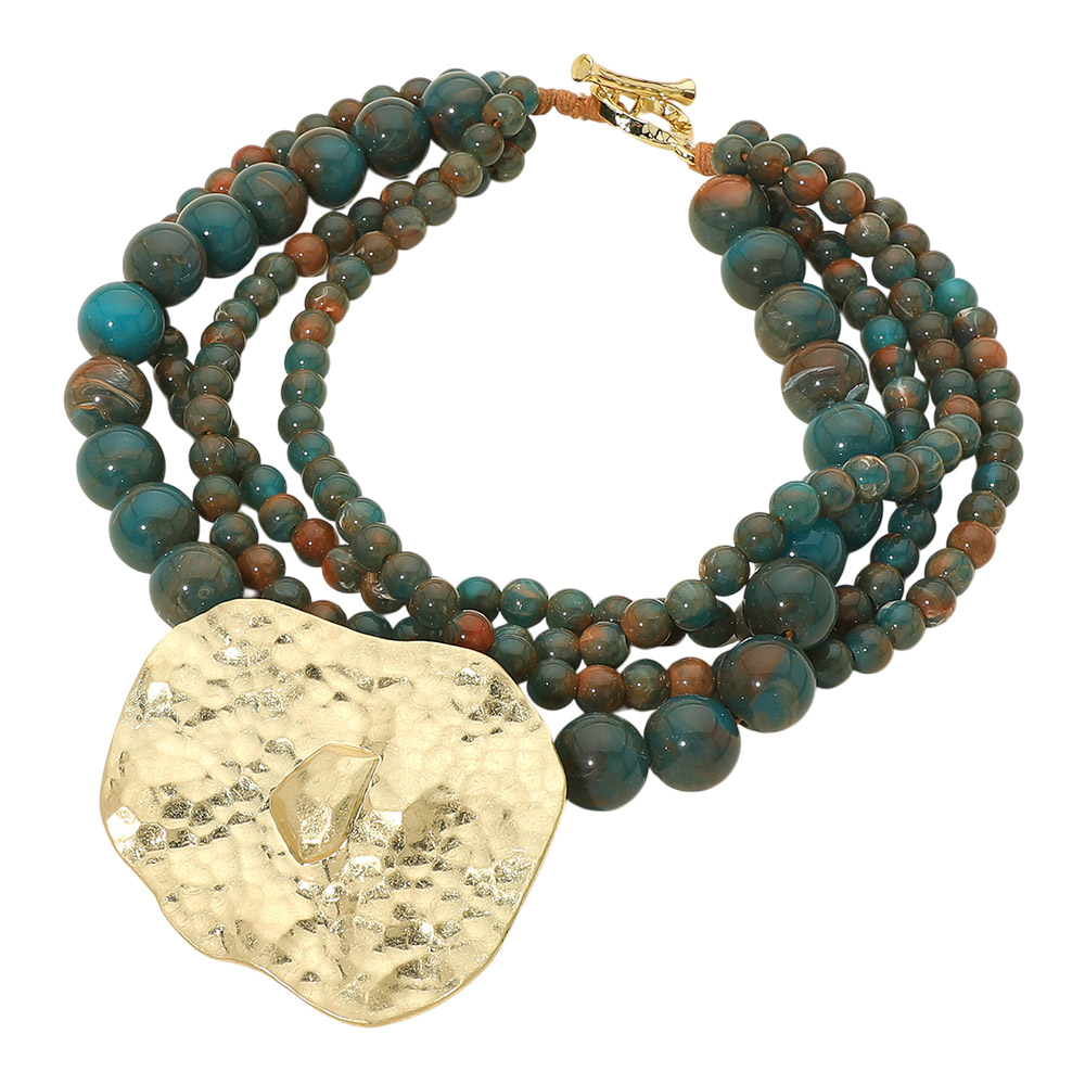 Details • Necklace Size : 19" + 1" L • Decor Size : 3.5" L • Eye-catching statement necklace designed with layered beaded strands and a bold textured pendant that creates depth and movement. This standout design offers a sculptural, fashion-forward look ideal for boutiques seeking unique statement jewelry that elevates everyday outfits, resort wear, and modern accessory collections. • Lead and Nickel Compliant
