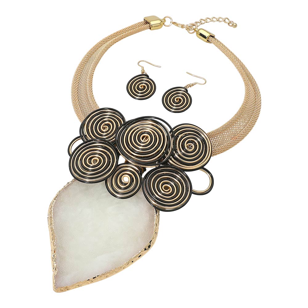 • This spiral pendant statement necklace set features layered circular wire accents paired with a bold centerpiece and coordinating drop earrings. Designed to create a modern artistic look, it adds strong visual impact and texture, making it ideal for boutiques seeking standout accessories for statement styling, special occasions, and elevated everyday outfits.