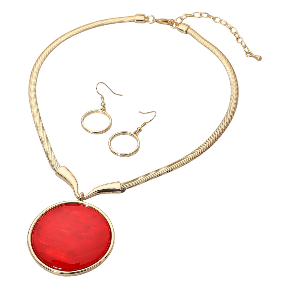 Details • Necklace Size : 17" + 3.75" L • Pendant Size : 1.8" X 2.1" • Earrings Size : 1.4" L • Elegant necklace and earring set featuring a bold round pendant with a marbled finish. Perfect for adding a sophisticated and modern accent to your everyday or special occasion outfits. • Lead and Nickel Compliant