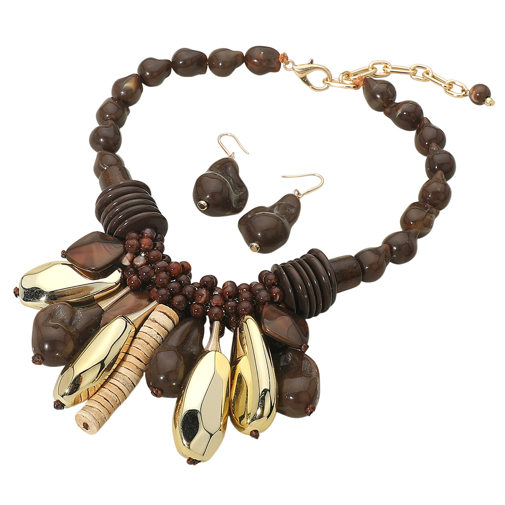 • This statement charm necklace and matching earring set features layered beads and sculptural accents for a bold, fashion-forward look. Designed to elevate boutique collections, it offers strong visual impact, versatile styling options, and standout appeal for trend-driven outfits and modern statement jewelry displays.