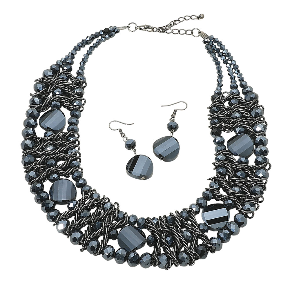 • Bold multi strand statement necklace set featuring layered faceted bead detailing with matching drop earrings. Designed for boutique styling, evening outfits, and special events, this coordinated jewelry set delivers eye-catching texture, dimensional shine, and elevated impact for dresses, blouses, and occasion-ready looks.