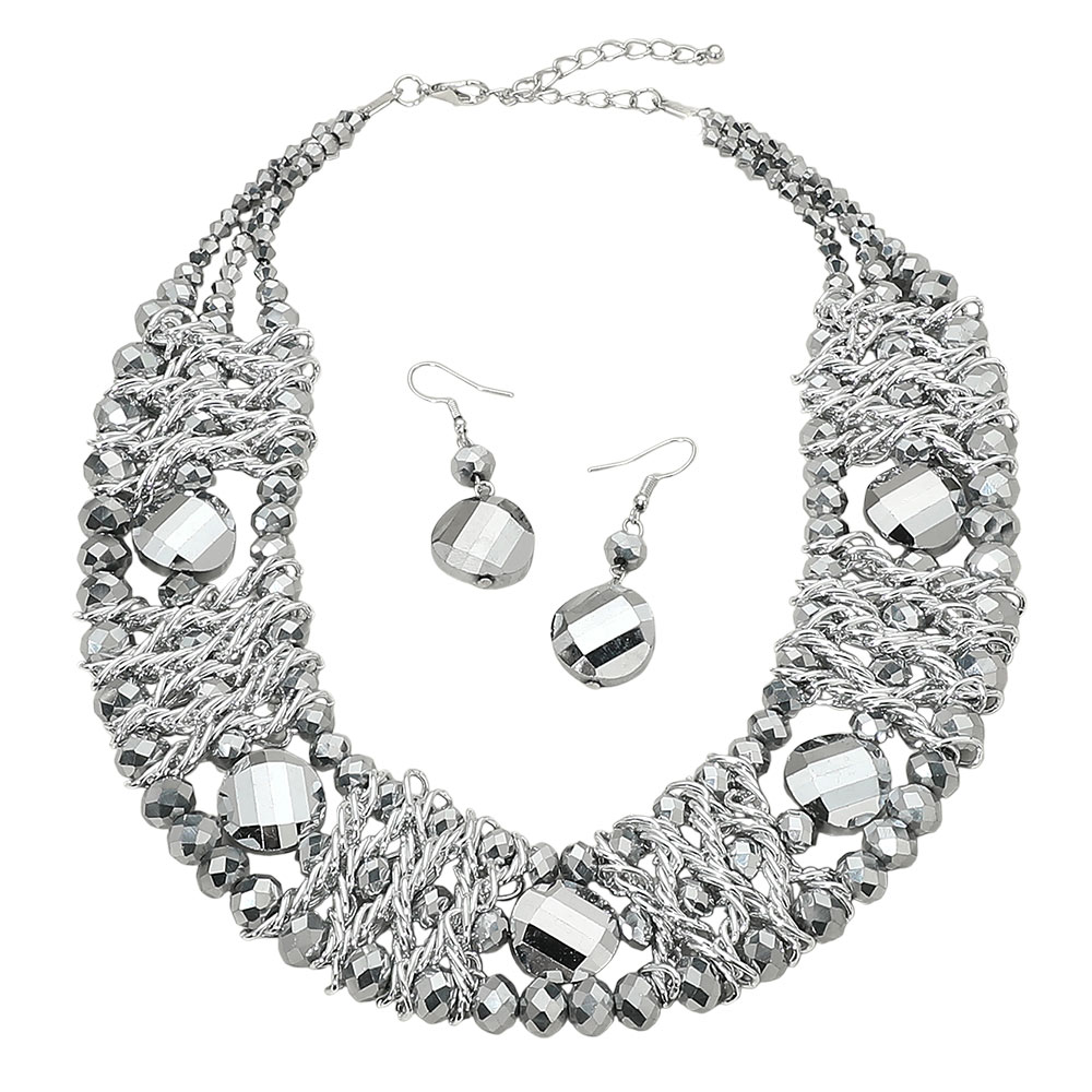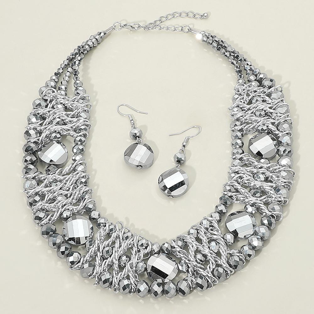• Bold multi strand statement necklace set featuring layered faceted bead detailing with matching drop earrings. Designed for boutique styling, evening outfits, and special events, this coordinated jewelry set delivers eye-catching texture, dimensional shine, and elevated impact for dresses, blouses, and occasion-ready looks.