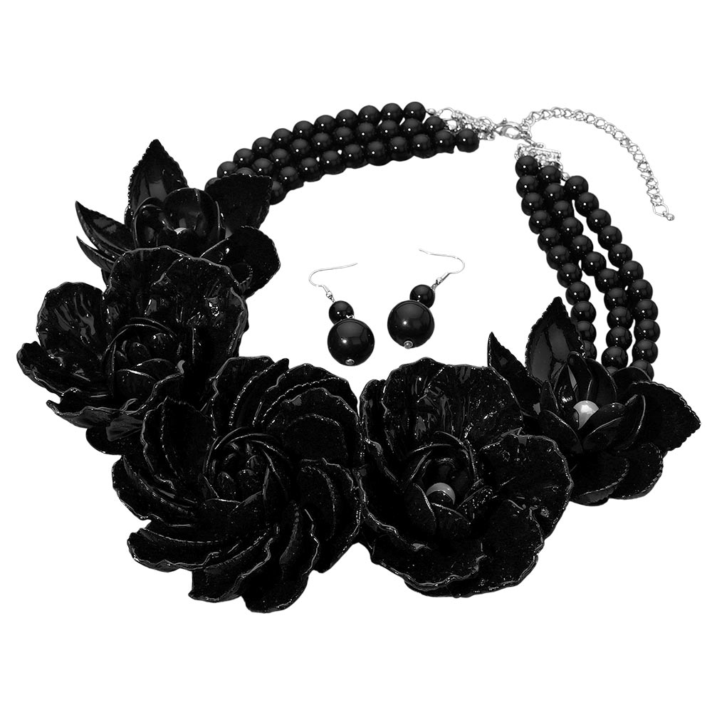 Details • Necklace Size : 21" + 4" L • Decor Size : 3.5" L • Earrings Size : 2" L • An elegant statement necklace set featuring layered floral accents and coordinating earrings with an adjustable fit. Designed to elevate formal looks, weddings, parties, and special occasions, offering graceful style and standout detail for memorable outfits. • Lead and Nickel Compliant