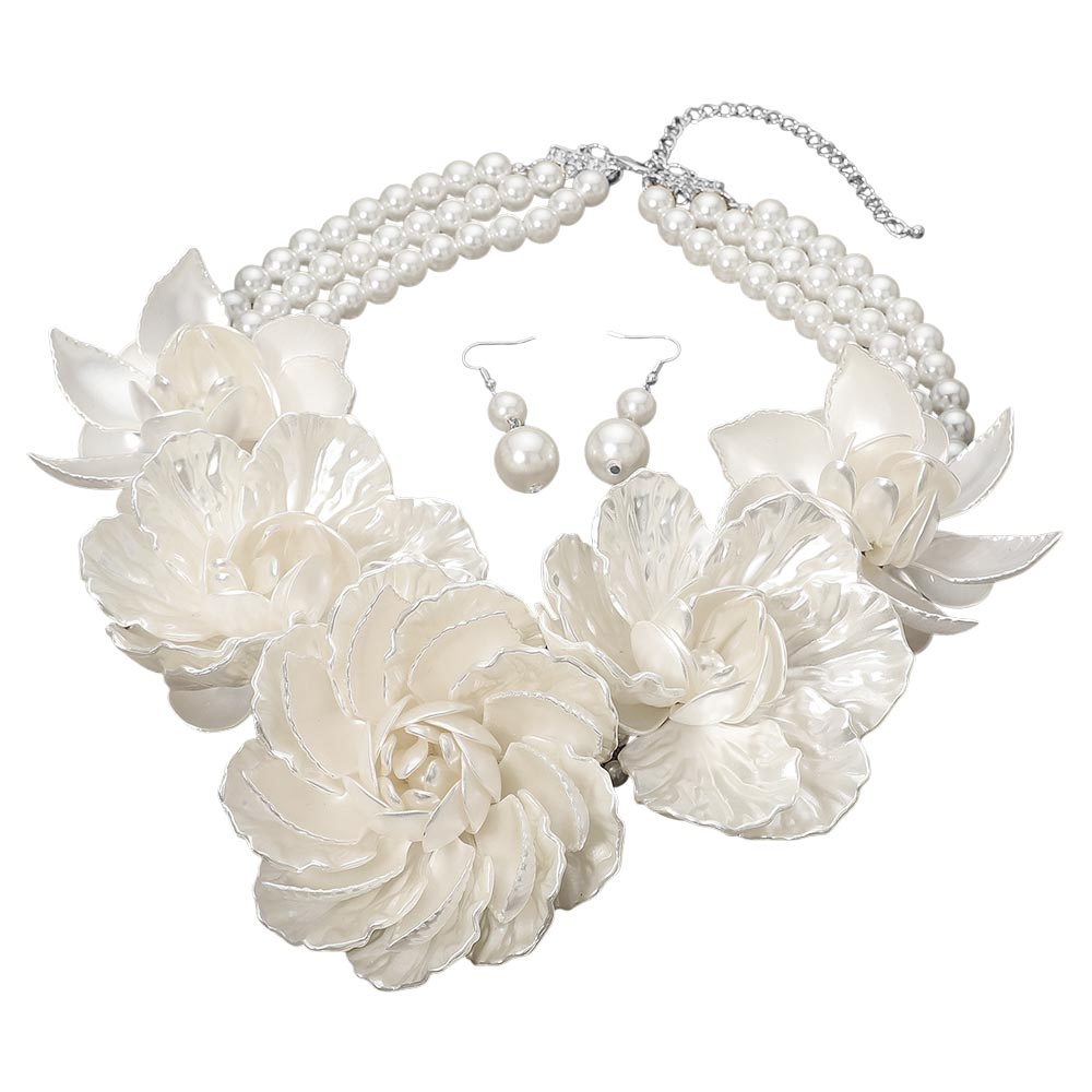 Bold Pearly Petal Floral Link Triple Pearl Strand Statement Necklace Bold Pearly Petal Floral Link Triple Pearl Strand Statement Necklace